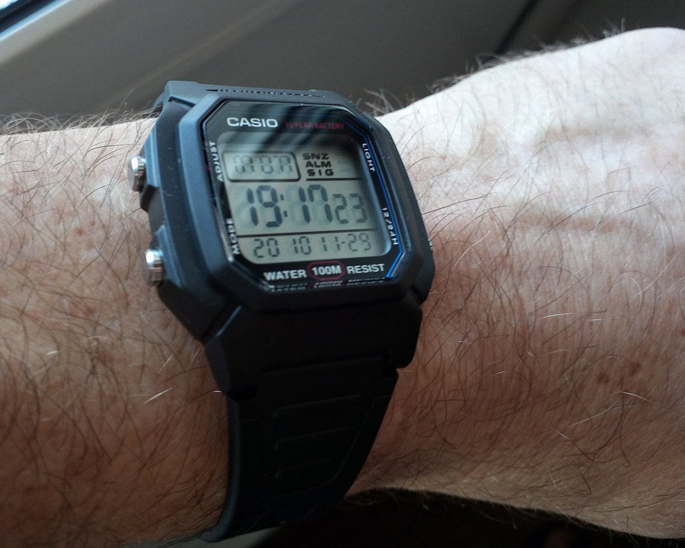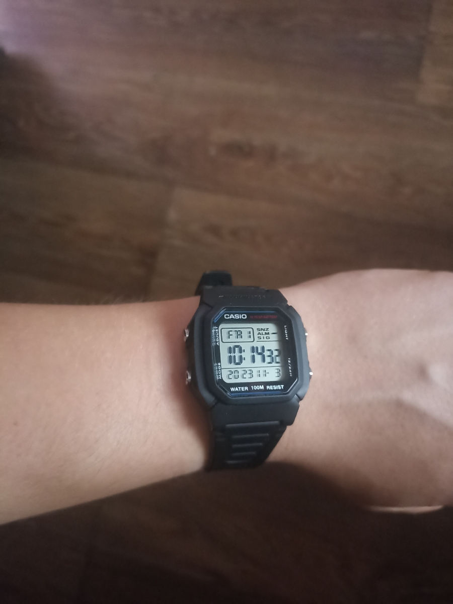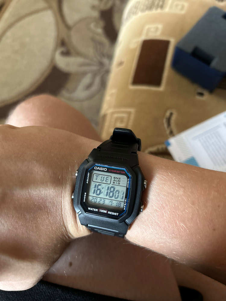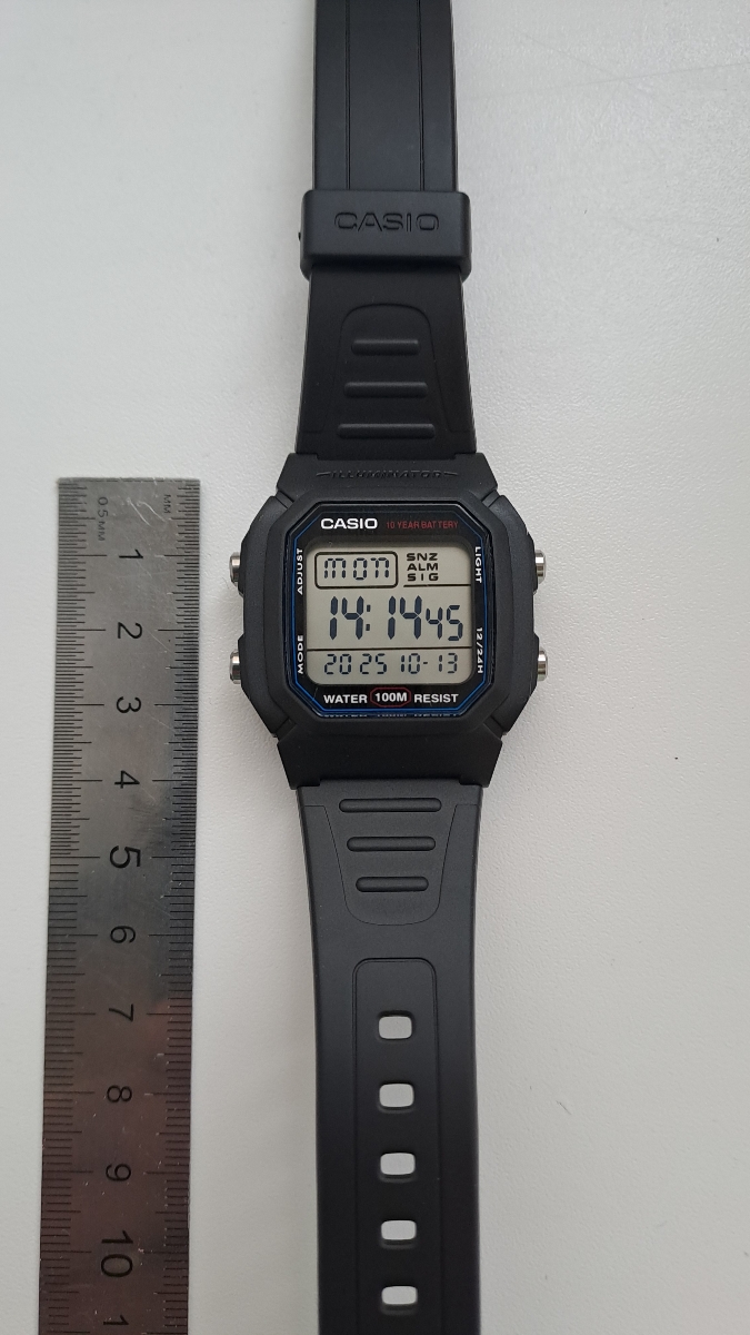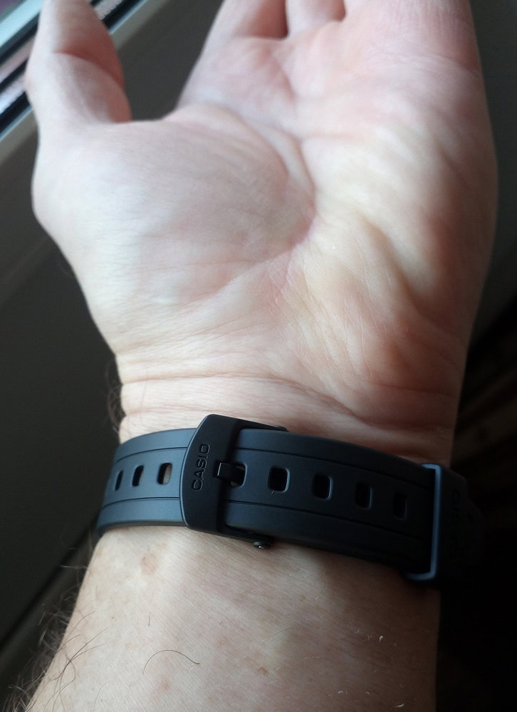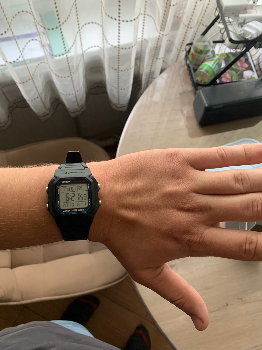 Думал, что будут маленькие, но размер то, что надо, даже на моем 19 см запястье. Ремешок с запасом на больший размер! Дисплей четкий, один из самых читабельный, время видно под любым углом и в сумерках. Зелёная подсветка. Кнопки нажимаются с усилием, это отлично, сами не нажмутся и время не собьется. Мне понравились часики, очень качественная и сбалансированная модель.