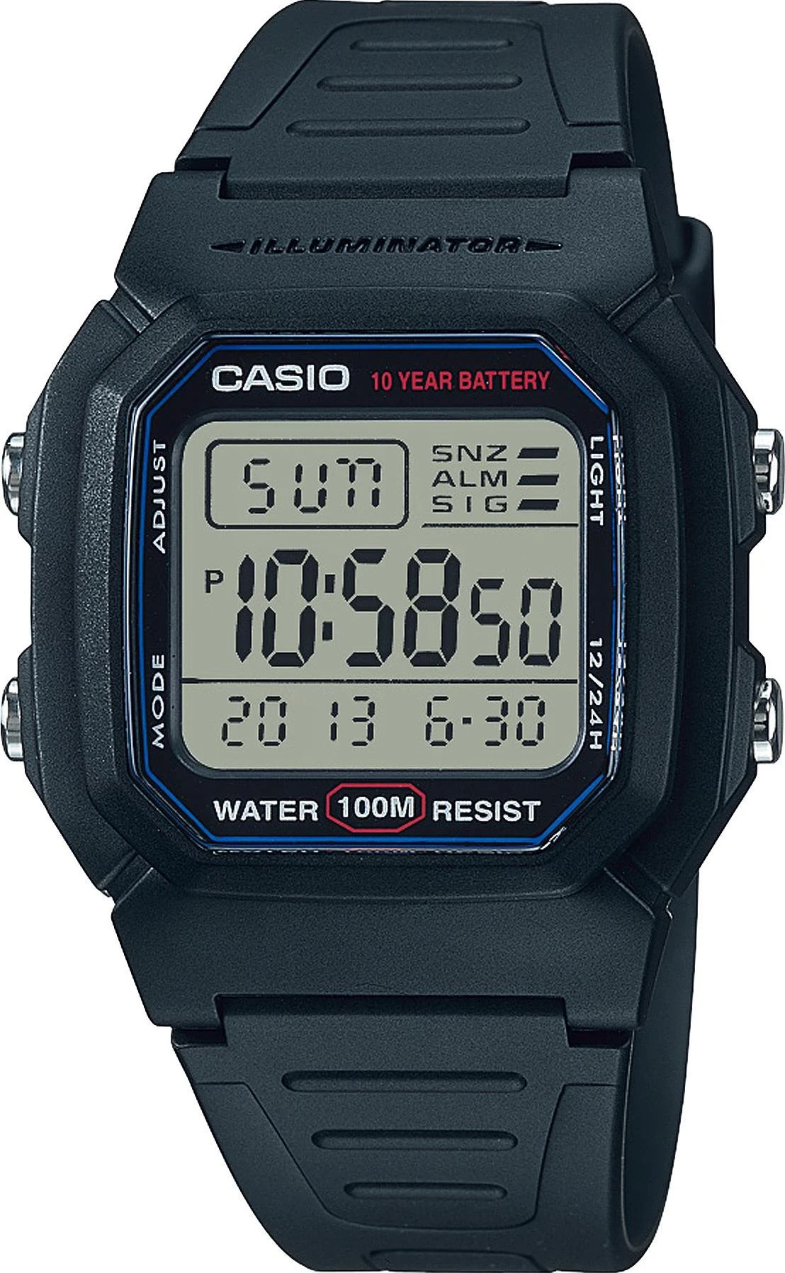• Электрическая подсветка - для освещения циферблата используется светодиод. • Одновременное отображение текущего времени в двух разных часовых поясах. • Секундомер с точностью показаний 1/100 сек и максимальным временем измерения - 24 час. •12/24 часовой формат времени. Функция многократного сигнала позволяет устанавливать ежедневный сигнал (только время) и сигнал на определенное время в определенный день (месяц, день и время). • Функция повтора сигнала будильника (Snooze). • Срок службы батареи 10 лет. • Автоматический календарь. • Ремешок из полимерного материала. • Размеры корпуса 36.8 мм (по оси заводной головки) х 44.2 мм (по вертикали) х 13.4 мм (толщина). Вес 37 грамм. Водостойкость WR100.