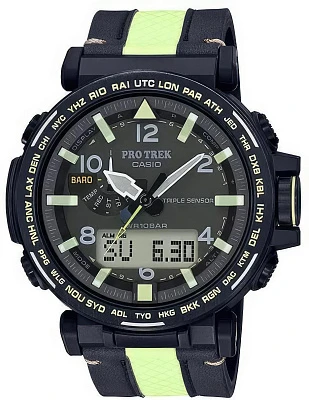 Мужские наручные часы Casio ProTrek PRG-601-1E. Точный кварцевый механизм с аналоговой индикацией. Корпус изготовлен из высококачественной нержавеющей стали 316L с высокими антикоррозийными свойствами. Светодиодная подсветка. На циферблате отображается текущее число, месяц и день недели. Ударопрочная конструкция часов защищает от ударов и вибрации. Солнечная батарейка. Солнечная подзаряжающаяся батарейка обеспечивает питание часов для работы. Встроенный цифровой компас определяет северный магнитный полюс. Термометр. Датчик измеряет температуру окружающего воздуха вокруг часов и отображает ее на экране в градусах. Высотомер (альтиметр). Встроенный датчик давления определяет изменения в атмосферном давлении и преобразовывает полученные результаты в абсолютную высоту. Специальный датчик измеряет давление воздуха и отображает измеренное значение на экране в виде символа. Это дает возможность заранее определить изменения погоды. Функция хронографа. Функция таймера. Таймеры обратного отсчета напомнят Вам о текущих или особенных событиях, издав звуковой сигнал в установленное время. Для подсветки дисплея используется светодиод, а так же имеет функцию автоматического включения подсветки, если Вы наклоните часы к своему лицу. Функция будильника. Индикатор запаса хода. Отображение текущего времени в основных городах и конкретных областях по всему миру. После настройки автоматический календарь всегда отображает точную дату. Отображение времени возможно в 12-часовом или 24-часовом формате. Полимерный ремешок. Натуральный полимерный материал является идеальным для изготовления ремешка благодаря своей чрезвычайной прочности и гибкости. Прочное, устойчивое к царапинам минеральное стекло защищает часы от повреждений. Часы являются водонепроницаемыми до 10 Бар. Цвет корпуса: Черный. Цвет циферблата: Черный. Ширина (с заводной головкой): 52мм. Толщина: 15мм. Гарантия: 2 года. Другие наименования модели: PRG-601-1.