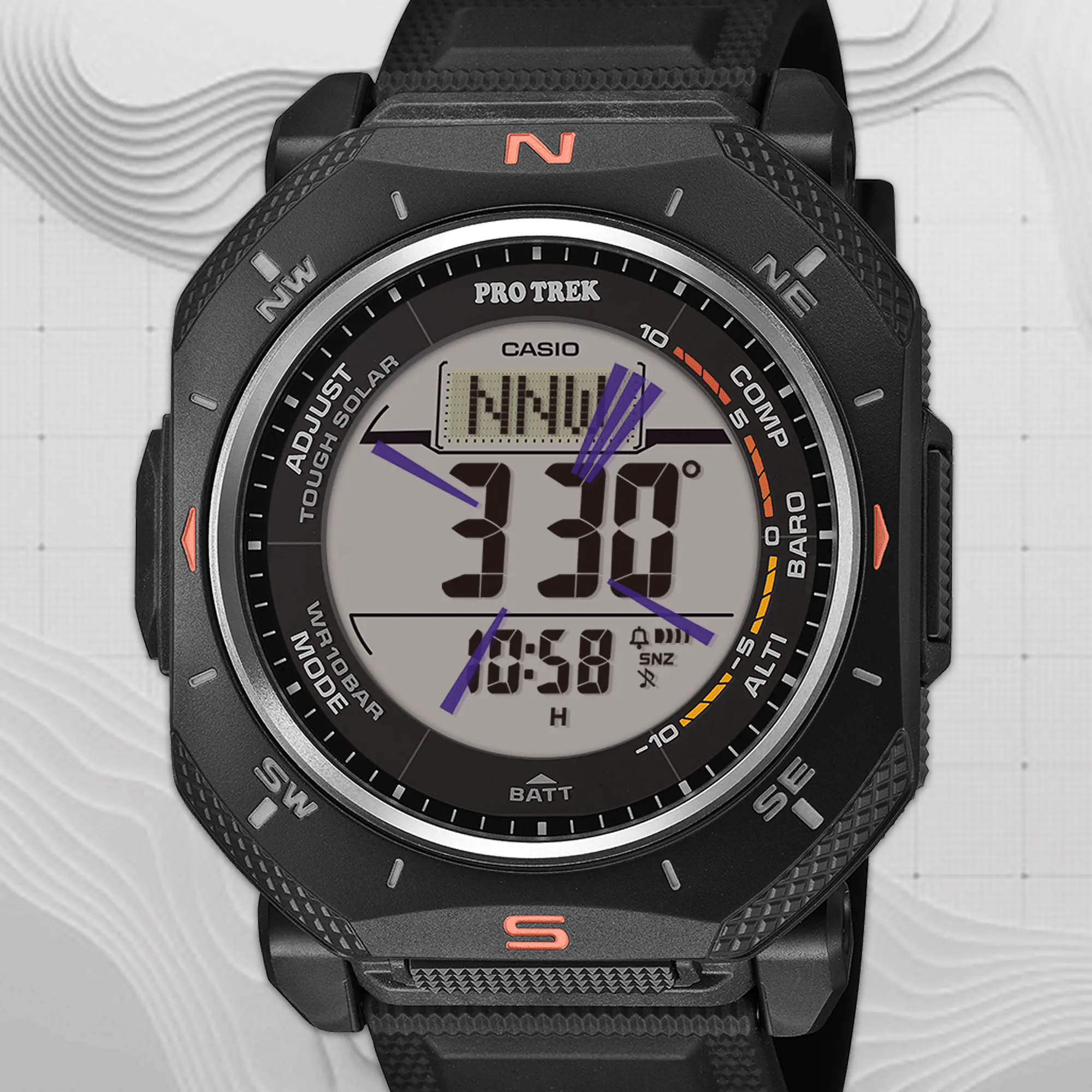 Главное преимущество модели — система Tough Solar, которая заряжает аккумулятор от источника света. Контролировать запас энергии помогает встроенный индикатор уровня заряда. За навигацию отвечает фирменный Triple Sensor: цифровой компас, альтиметр (до 10 000 м) с памятью данных, барометр для прогнозирования погоды и термометр. Для планирования маршрута предусмотрена функция отображения времени восхода и захода солнца, а мировое время в 48 городах делает модель удобной для дальних путешествий. Высокоточный секундомер с шагом 1/10 секунды и пределом измерения до 1000 часов, а также 24-часовой таймер позволяют четко контролировать время. Система из 5 независимых будильников и функция ежечасного сигнала помогут не пропустить важные события. Модель адаптирована к суровым условиям: сохраняет работоспособность при низких температурах до –10°C и обладает водозащитой 10 бар. Это надежный, автономный и функциональный спутник для тех, кто привык полагаться на точные приборы в любой точке мира.