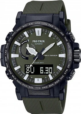 Этот аксессуар не только обладает базовыми функциями для приключений, но и имеет стильный и интересный дизайн. Pro Trek. Мужские часы. Уникальный поворотный безель позволит в одно движение сменить стиль часов, а также получить доступ к кнопкам, которые он защищает от случайного нажатия. Корпус и ремешок выполнены из биопластика, который изготавливается из возобновляемых органических ресурсов. Питание от солнечной энергии Tough Solar - солнечные батарейки большой мощности, индикатор заряда батареи. Функция автоматического сохранения энергии. Время работы аккумулятора без подзарядки приблизительно 7 месяцев, при включенной функции сохранения энергии приблизительно 18 месяцев. Модуль часов рассчитан на работу при низких температурах до -10°С. Двойная подcветка: циферблат и ЖК-дисплеи подсвечиваются светодиодом, благодаря наличию функции задержки, после отпускания кнопки освещение горит еще несколько секунд. Настраиваемое послесвечение 1,5 или 3сек. Цвет подсветки: белый. Необритовое светонакопительное покрытие обеспечивает длительное послесвечение в темноте даже после кратковременного нахождения на свету. 12-ти и 24-х часовой формат времени. Секундомер с двумя точностями показаний: 1/100с (до 1ч) и 1с (после 1ч) и временем измерения 24ч. SPLIT-хронограф. Таймер обратного отсчета от 1с до 24ч. Мировое время – 38 городов (38 часовых поясов), всемирное координированное время (UTC). Автоматический переход на зимнее и летнее время, возможность включения/отключения данной функции. Отображение кода и названия города. Переключение между домашним и мировым временем. Беспроводная технология Bluetooth® со сверхнизким потреблением энергии для синхронизации со смартфоном с помощью приложения Casio Watches. При подключении к смартфону часы корректируют текущее время, копируют настройки мирового времени (300 городов), а также позволяют получить данные о месте и времени (нажатие кнопки на часах записывает текущее время и положение на карте в приложении). Отображение дня недели на шести языках. Функции перемещения стрелок, поиска телефона и включения/отключения звука. Стрелка в положении «9 часов» вдохновлена карабином. Безель вращается на 45 градусов. Задняя крышка крепится на 4-х винтах. Ремешок с классической застежкой и системой быстрой замены.