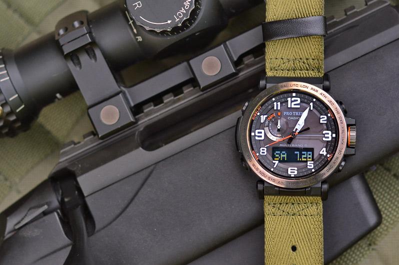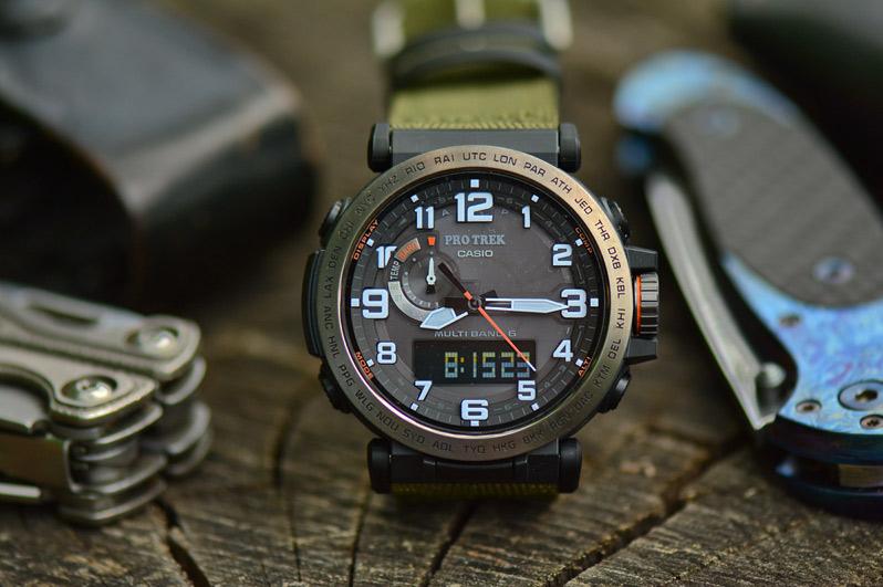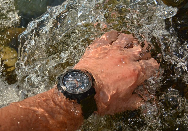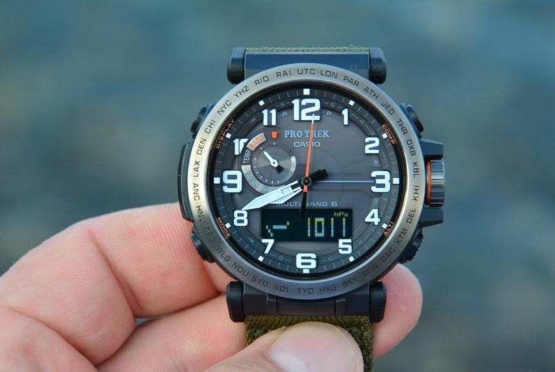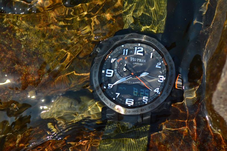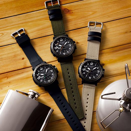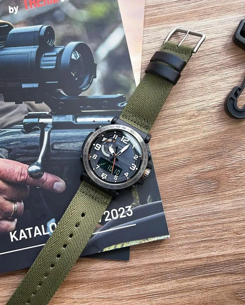 Многофункциональные часы для экстремального туризма. Оформление в темном цвете со стальным безелем. Компас, барометр/альтиметр и термометр. График набора и память данных высоты. Подстройка времени по радиосигналам и работа от солнечных батарей.