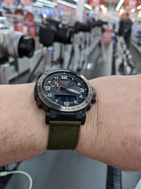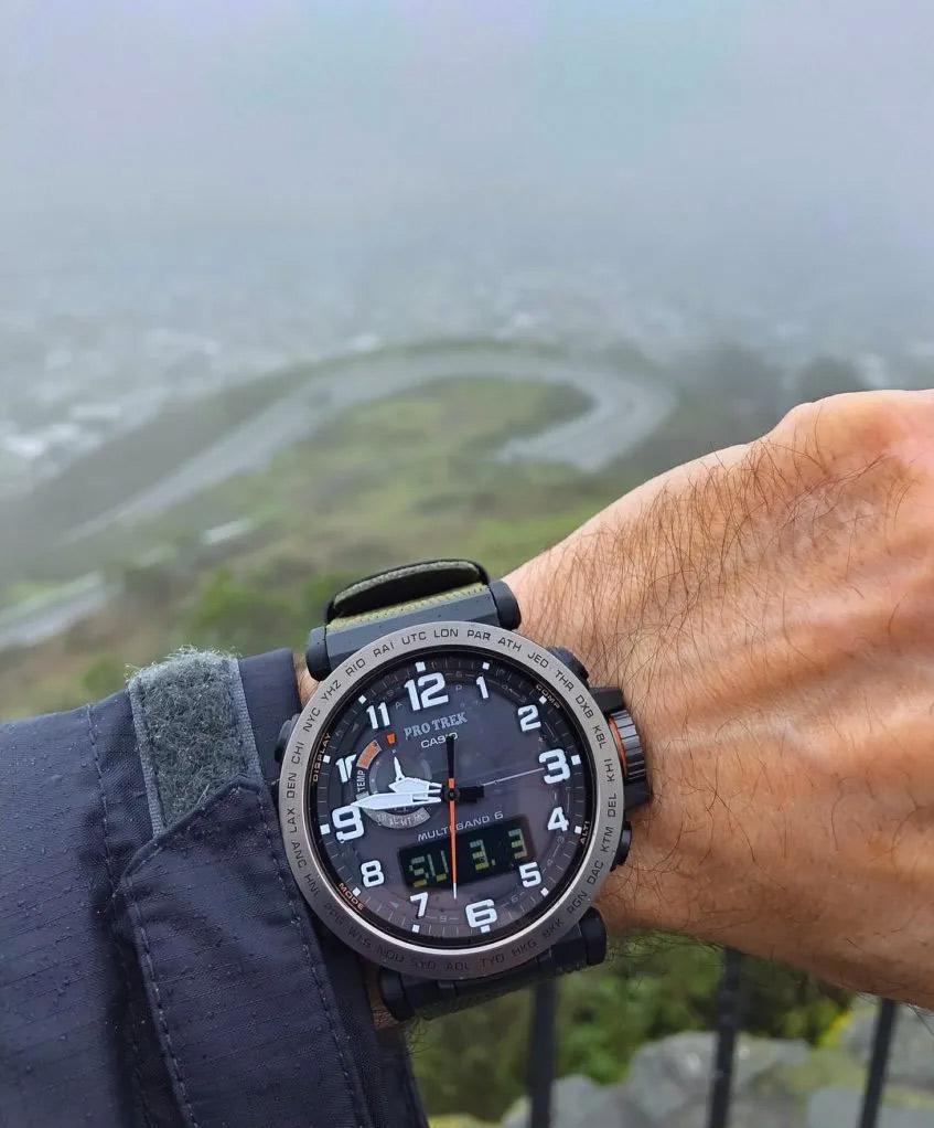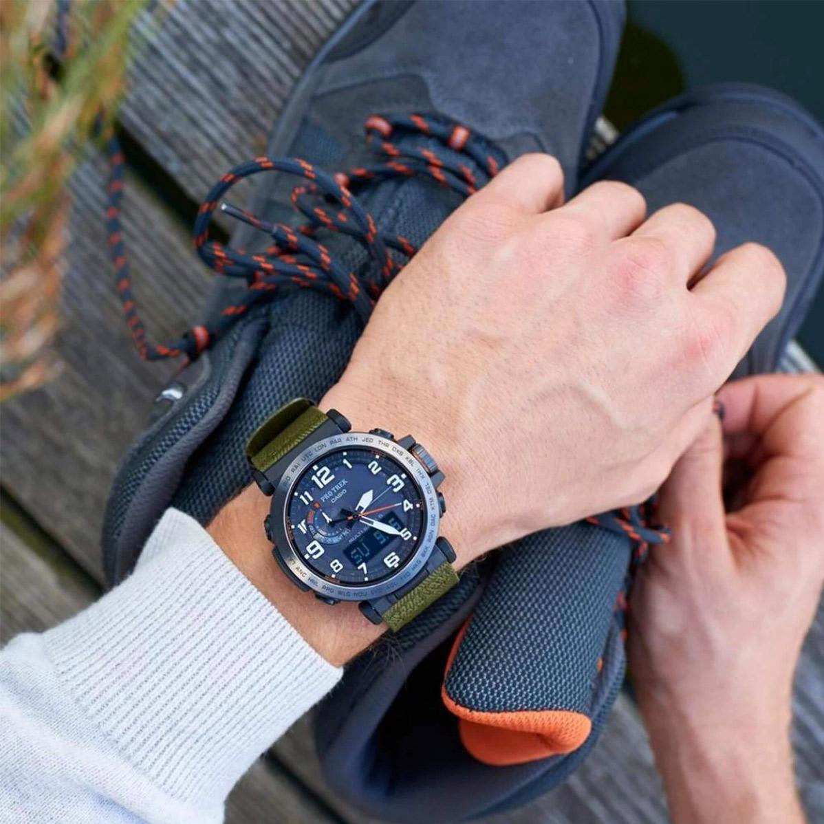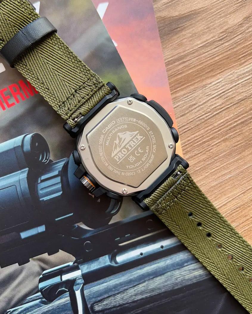 Многофункциональные часы для экстремального туризма. Оформление в темном цвете со стальным безелем. Компас, барометр/альтиметр и термометр. График набора и память данных высоты. Подстройка времени по радиосигналам и работа от солнечных батарей.