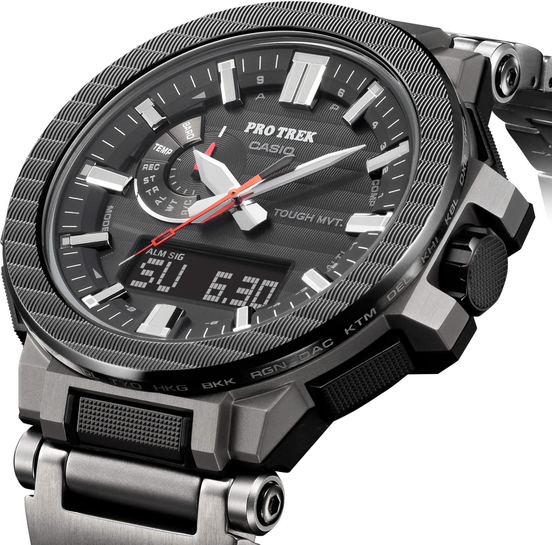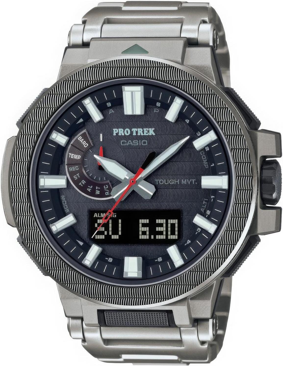 Мужские наручные часы Casio ProTrek PRX-8001YT-7E. Точный кварцевый механизм с аналого-цифровой индикацией. Корпус изготовлен из высокопросчного титана. Светодиодная подсветка. На циферблате отображается текущее число, месяц и день недели. Солнечная батарейка. Солнечная подзаряжающаяся батарейка обеспечивает питание часов для работы. Встроенный цифровой компас определяет северный магнитный полюс. Высотомер (альтиметр). Встроенный датчик давления определяет изменения в атмосферном давлении и преобразовывает полученные результаты в абсолютную высоту. Специальный датчик измеряет давление воздуха и отображает измеренное значение на экране в виде символа. Это дает возможность заранее определить изменения погоды. Функция хронографа. Функция таймера. Таймеры обратного отсчета напомнят Вам о текущих или особенных событиях, издав звуковой сигнал в установленное время. Для подсветки дисплея используется светодиод, а так же имеет функцию автоматического включения подсветки, если Вы наклоните часы к своему лицу. Функция будильника. Аккумулятор обеспечивает часы достаточным питанием приблизительно на 3 года. Записная книжка. Сохраненные имена и телефонные номера всегда под рукой благодаря встроенной базе данных. Отображение текущего времени в основных городах и конкретных областях по всему миру. После настройки автоматический календарь всегда отображает точную дату. Отображение времени возможно в 12-часовом или 24-часовом формате. Титановый браслет. Сапфировое стекло. Искусственно изготовленное стекло с высокой прочностью и устойчивостью к царапинам. Часы являются водонепроницаемыми до 3 Бар. Цвет корпуса: Серебристый. Цвет циферблата: Черный. Ширина (с заводной головкой): 53мм. Толщина: 14мм. Гарантия: 2 года.