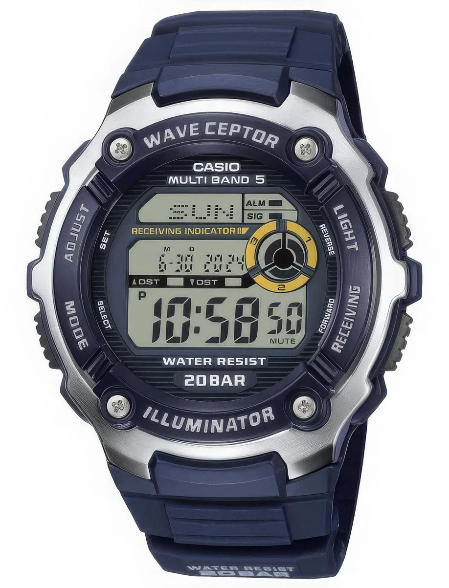 Мужские наручные часы Casio Radio Controlled WV-200R-2A. Точный кварцевый механизм с цифровой индикацей. Полимерный ремешок. Натуральный полимерный материал является идеальным для изготовления ремешка благодаря своей чрезвычайной прочности и гибкости. Отображение текущего времени в основных городах и конкретных областях по всему миру. Функция будильника. Функция хронографа. Радио-синхронизация. Часы будут получать радио-сигнал калибровки, гарантирующий, что они всегда будут показывать точное время. Для подсветки дисплея используется светодиод, а так же имеет функцию автоматического включения подсветки, если Вы наклоните часы к своему лицу. После настройки автоматический календарь всегда отображает точную дату. Полимерный ремешок. Натуральный полимерный материал является идеальным для изготовления ремешка благодаря своей чрезвычайной прочности и гибкости. Прочное, устойчивое к царапинам минеральное стекло защищает часы от повреждений. На циферблате отображается текущее число, месяц и день недели. Часы являются водонепроницаемыми до 20 Бар. Цвет циферблата: Синий. Цвет корпуса: Серый. Светодиодная подсветка. Высота (с ушками): 52 мм. Толщина: 15 мм. Гарантия: 2 года.