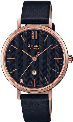 Женские наручные часы Casio Sheen SHE-4539CGL-1A. Точный кварцевый механизм с аналоговой индикацией. Корпус изготовлен из высококачественной нержавеющей стали 316L с высокими антикоррозийными свойствами. На циферблате отображается текущее число месяца. Ремешок изготовлен из кожи. Сапфировое стекло. Искусственно изготовленное стекло с высокой прочностью и устойчивостью к царапинам. Часы являются водонепроницаемыми до 5 Бар. Цвет корпуса: Розовое золото. Цвет циферблата: Черный. Гарантия: 2 года.