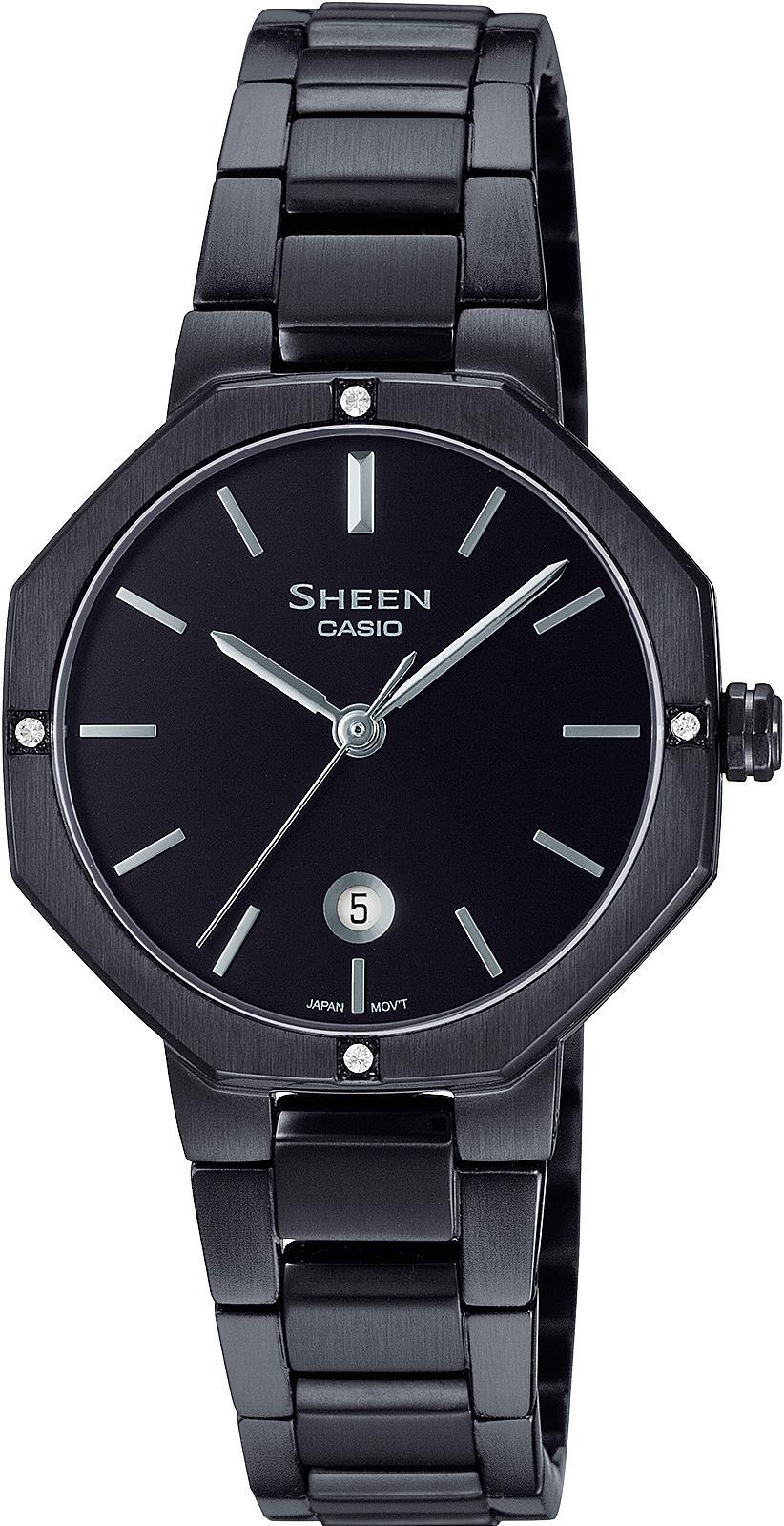 Женские кварцевые часы из серии Sheen. Круглый ультратонкий стальной корпус с PVD покрытием черного цвета украшен кристаллами Swarovski. Сапфировое стекло. Водозащита 50 м. Стальной браслет с PVD покрытием черного цвета. Раскладывающаяся застежка.