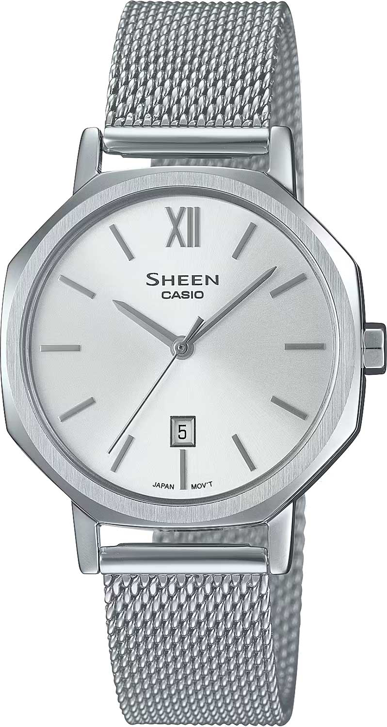 Женские наручные часы Casio Sheen SHE-4554M-7A. Точный кварцевый механизм с аналоговой индикацией. Корпус изготовлен из высококачественной нержавеющей стали 316L с высокими антикоррозийными свойствами. Аккумулятор обеспечивает часы достаточным питанием приблизительно на 3 года. Браслет из нержавеющей стали. Сапфировое стекло. Искусственно изготовленное стекло с высокой прочностью и устойчивостью к царапинам. Часы являются водонепроницаемыми до 5 Бар. Цвет корпуса: Серебристый. Цвет циферблата: Белый. Ширина (с заводной головкой): 41мм. Толщина: 8мм. Гарантия: 2 года. Другие наименования модели: SHE-4554M-7AUEF.