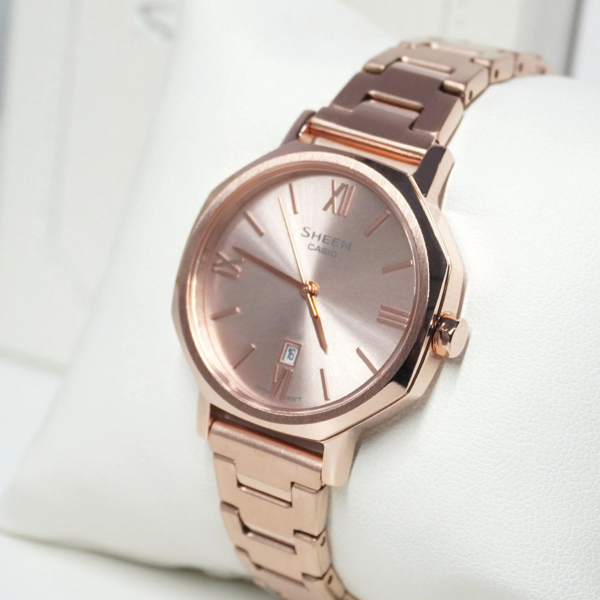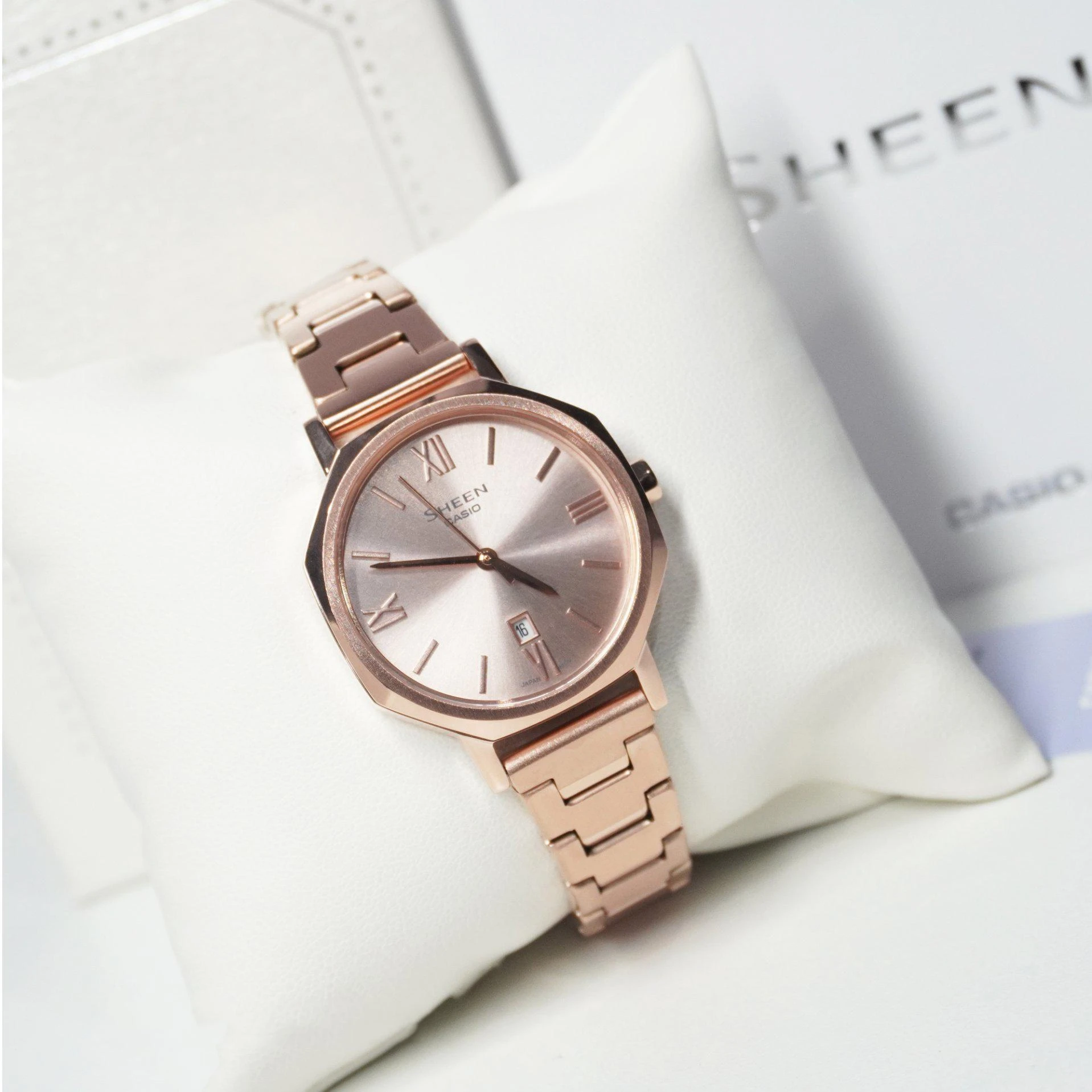 Женские наручные часы Casio Sheen SHE-4554PG-4A. Точный кварцевый механизм с аналоговой индикацией. Браслет из нержавеющей стали. Аккумулятор обеспечивает часы достаточным питанием приблизительно на 3 года. Браслет из нержавеющей стали. Сапфировое стекло. Искусственно изготовленное стекло с высокой прочностью и устойчивостью к царапинам. На циферблате отображается текущее число месяца. Часы являются водонепроницаемыми до 5 Бар. Цвет циферблата: Розовое золото. Цвет корпуса: Золотистый. Высота (с ушками): 37 мм. Толщина: 8 мм. Гарантия: 2 года.