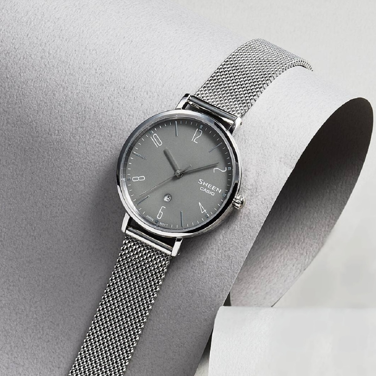 Женские наручные часы Casio Sheen SHE-4562M-8A. Точный кварцевый механизм с аналоговой индикацией. Браслет из нержавеющей стали. Браслет из нержавеющей стали. Сапфировое стекло. Искусственно изготовленное стекло с высокой прочностью и устойчивостью к царапинам. На циферблате отображается текущее число месяца. Часы являются водонепроницаемыми до 5 Бар. Цвет циферблата: Серебристый. Цвет корпуса: Серый. Высота (с ушками): 41 мм. Толщина: 6 мм. Гарантия: 2 года.