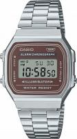 Мужские наручные часы Casio Vintage A-168WA-5A. Точный кварцевый механизм с цифровой индикацией. Корпус изготовлен из полимерного материала. Светодиодная подсветка. На циферблате отображается текущее число, месяц и день недели. Функция хронографа. Функция таймера. Таймеры обратного отсчета напомнят Вам о текущих или особенных событиях, издав звуковой сигнал в установленное время. Функция будильника. Аккумулятор обеспечивает часы достаточным питанием приблизительно на 7 лет. После настройки автоматический календарь всегда отображает точную дату. Отображение времени возможно в 12-часовом или 24-часовом формате. Браслет из нержавеющей стали. Органическое стекло. Часы являются водонепроницаемыми до 3 Бар. Цвет корпуса: Серебристый. Цвет циферблата: Коричневый. Ширина (с заводной головкой): 39мм. Толщина: 10мм. Гарантия: 2 года. Другие наименования модели: A-168WA-5AYD.