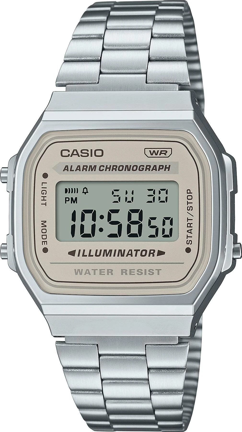 Унисекс наручные часы Casio Vintage A-168WA-8A. Точный кварцевый механизм с цифровой индикацей. В отличие от механических часов, не требуют завода и работают от батареи, показывая отклонение всего несколько секунд в месяц. Светодиодная подсветка обеспечивает равномерное и энергоэффективное освещение циферблата. Для активации обычно требуется нажатие отдельной кнопки, что позволяет экономить заряд батареи. Браслет из нержавеющей стали обладает высокой прочностью и износостойкостью, обеспечивая долговечность даже при активной эксплуатации. Материал устойчив к коррозии и сохраняет свой внешний вид надолго. Функция будильника. Функция хронографа. Ежечасный сигнал. После настройки автоматический календарь всегда отображает точную дату. Отображение времени возможно в 12-часовом или 24-часовом формате. Аккумулятор обеспечивает часы достаточным питанием приблизительно на 7 лет. Полимерный корпус надежно защищает часы от механических повреждений. Органическое стекло. Часы являются водонепроницаемыми до 3 Бар. Цвет корпуса: Серебристый. Цвет циферблата: Бежевый. Высота (с ушками): 38.6 мм. Толщина: 9.6 мм. Гарантия: 2 года. Другие наименования модели: A-168WA-8AYD, A168WA-8AYDF, A168WA-8A.