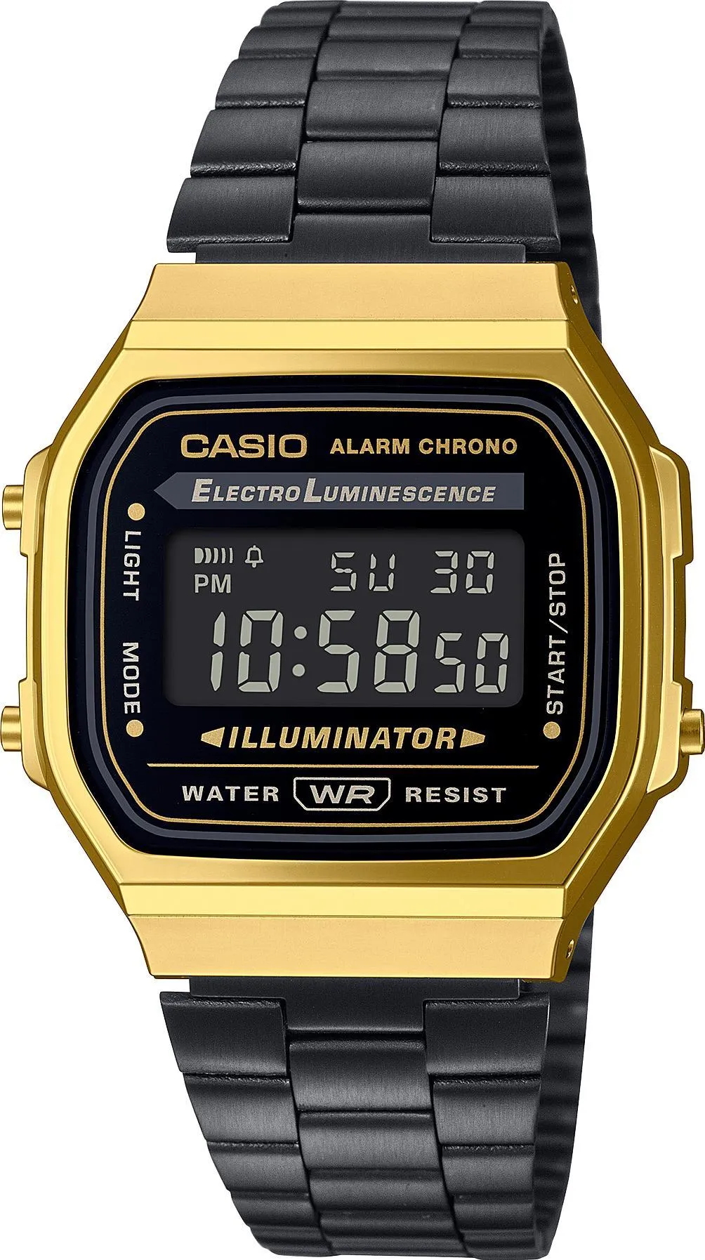 Унисекс наручные часы Casio Vintage A-168WEGB-1B. Простые и удобные в использовании часы на каждый день в золотисто-черном исполнении. Электролюминесцентная подсветка. Цвет подсветки: сине-зеленый. 12-ти и 24-х часовой формат времени. Секундомер с точностью показаний 1/100с и временем измерения 1ч. Секундомер с функцией SPLIT. Ежедневный будильник, ежечасный сигнал. Автоматический календарь (28 дней на февраль). Примерное время работы от батареи: 7 лет на батарейке CR2016. Стальная задняя крышка крепится на 4-х винтах. Браслет с регулируемой застежкой. Другие наименования модели: A168WEGB-1B, A168WEGB-1BDF, A168WEGB-1BEF, A168WEGB-1BF, A-168WEGB-1BD.
