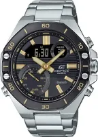Мужские наручные часы Casio Edifice ECB-10DB-1A9. Точный кварцевый механизм с аналого-цифровой индикацией. Браслет из нержавеющей стали. После настройки автоматический календарь всегда отображает точную дату. Аккумулятор обеспечивает часы достаточным питанием приблизительно на 2 года. Функция Bluetooth позволяет удобно отображать все метрики с часов на экране смартфона, а также выводить на часы уведомления о входящих звонках, сообщениях и имейлах. Функция будильника. Ежечасный сигнал. Функция хронографа. Отображение текущего времени в основных городах и конкретных областях по всему миру. Функция таймера. Таймеры обратного отсчета напомнят Вам о текущих или особенных событиях, издав звуковой сигнал в установленное время. Отображение времени возможно в 12-часовом или 24-часовом формате. Браслет из нержавеющей стали. Прочное, устойчивое к царапинам минеральное стекло защищает часы от повреждений. На циферблате отображается текущее число, месяц и день недели. Часы являются водонепроницаемыми до 10 Бар. Цвет циферблата: Серебристый. Цвет корпуса: Желтый. Цвет корпуса: Черный. На стрелки и отметки нанесен светонакопительный состав, благодаря этому считывать информацию с циферблата возможно и в темноте. Высота (с ушками): 51 мм. Толщина: 13 мм. Гарантия: 2 года.