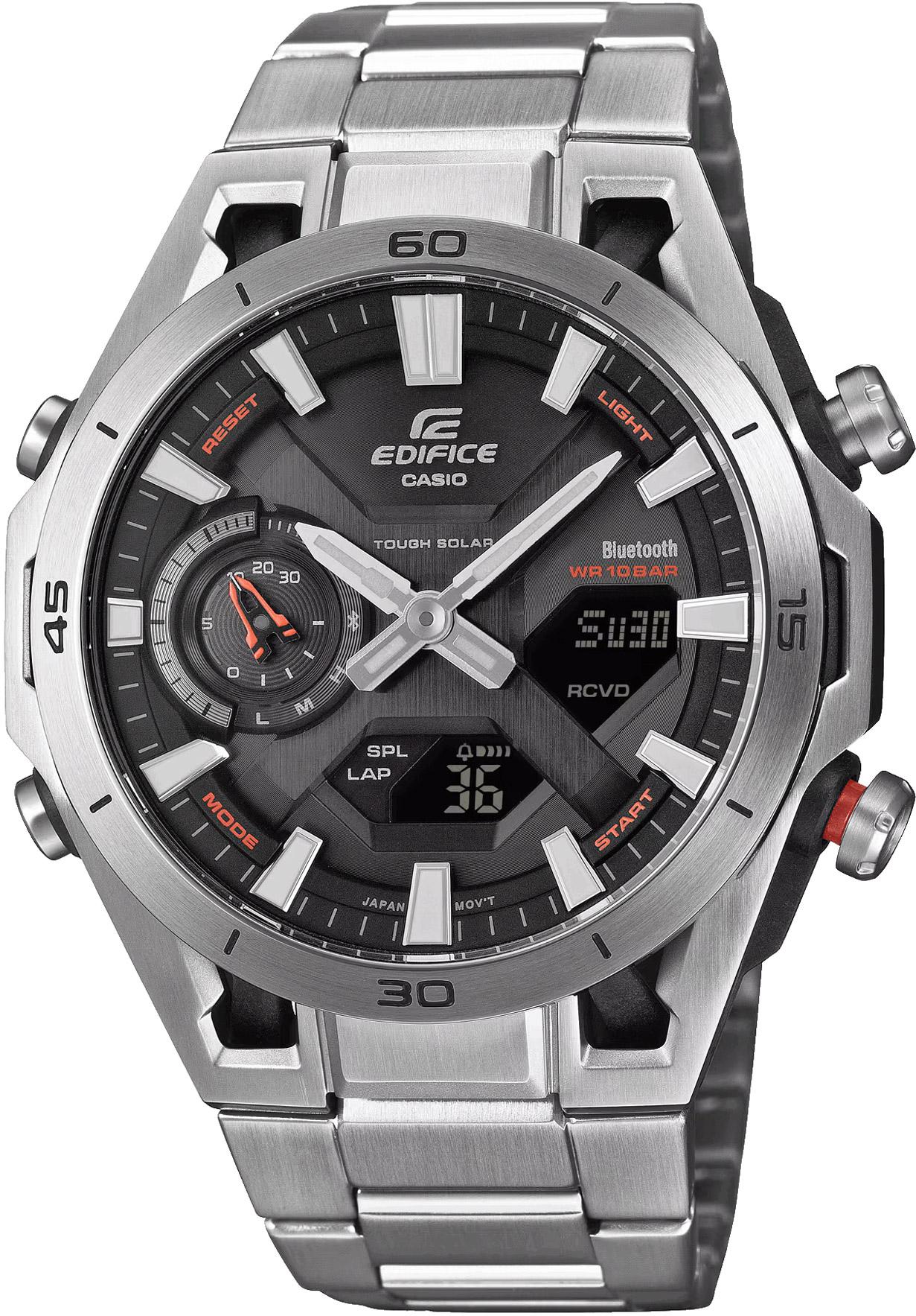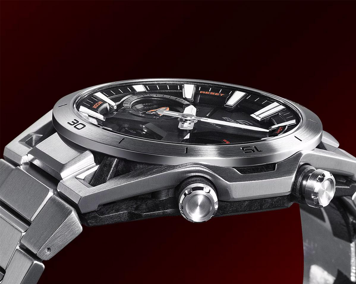 Харизматичный и узнаваемый релиз Casio в коллекции Edifice 2025 года из аналого-цифровой серии ECB-2300 в усиленном карбоном корпусе с черным циферблатом, покрытым минеральным стеклом и стальным безелем. Модель имеет стильный и эргономичный многоуровневый циферблат, который сочетает в себе индикацию времени с помощью контрастных стрелок, два цифровых инверсионных дисплея и стрелочный ретроградный указатель у отметки девяти часов. Особенностью модели является прочный и легкий карбоно-стальной корпус — это одни из немногочисленных часов Edifice в корпусе из карбона. Необычная узнаваемая конструкция корпуса выполнена в стилистике подвесок в формульных гонках, где колеса болида крепятся к шасси на карбоновых лучах. В модели используется мощный модуль, оснащенный Bluetooth, благодаря чему часы могут автоматически подключаться к вашему смартфону через приложение CASIO WATCHES для синхронизации точного времени, удобной настройки или для быстрого поиска телефона. Стоит отметить наличие в модели солнечной батареи, водозащиты в 10 бар, функции мирового времени, секундомера и таймера обратного отсчета, пяти ежедневных будильников и ежечасного сигнала, возможность отображения текущего дня недели на русском языке. Толщина корпуса — 10.9 мм.
