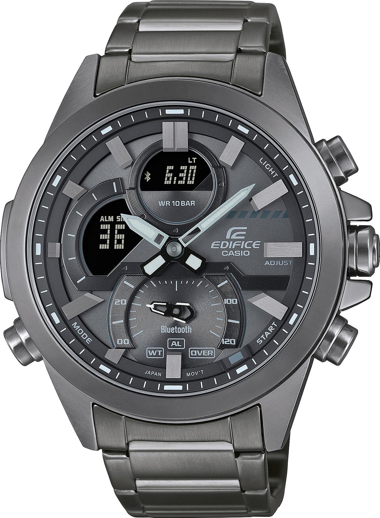 Мужские наручные часы Casio Edifice ECB-30DC-1B. Точный кварцевый механизм с аналого-цифровой индикацией. Корпус изготовлен из высококачественной нержавеющей стали 316L с высокими антикоррозийными свойствами. На циферблате отображается текущее число месяца и день недели. Функция Bluetooth позволяет удобно отображать все метрики с часов на экране смартфона, а также выводить на часы уведомления о входящих звонках, сообщениях и имейлах. Функция хронографа. Функция таймера. Таймеры обратного отсчета напомнят Вам о текущих или особенных событиях, издав звуковой сигнал в установленное время. Функция будильника. Аккумулятор обеспечивает часы достаточным питанием приблизительно на 2 года. Отображение текущего времени в основных городах и конкретных областях по всему миру. После настройки автоматический календарь всегда отображает точную дату. Отображение времени возможно в 12-часовом или 24-часовом формате. Браслет из нержавеющей стали. Прочное, устойчивое к царапинам минеральное стекло защищает часы от повреждений. Часы являются водонепроницаемыми до 10 Бар. Цвет корпуса: Черный. Цвет циферблата: Черный. Ширина (с заводной головкой): 52мм. Толщина: 13мм. Гарантия: 2 года.