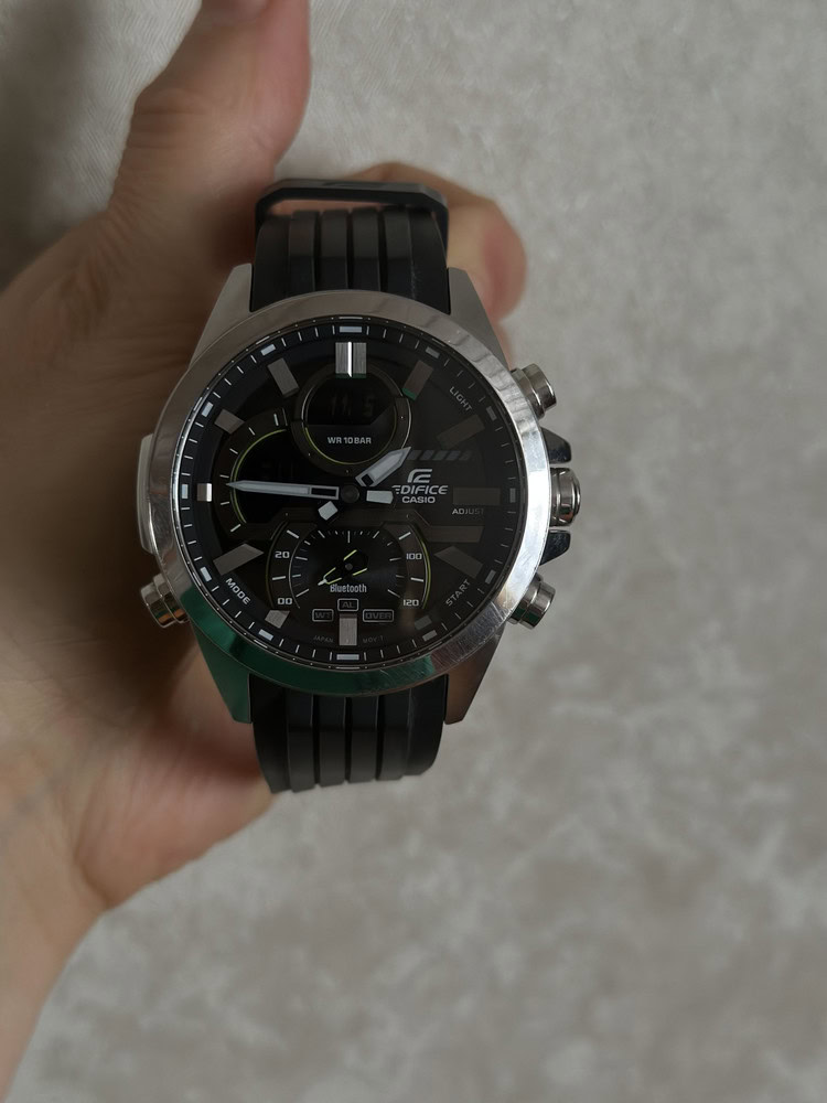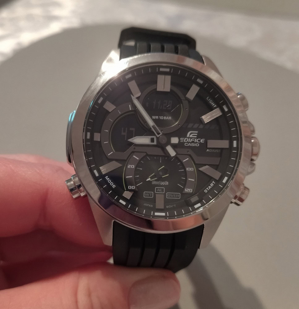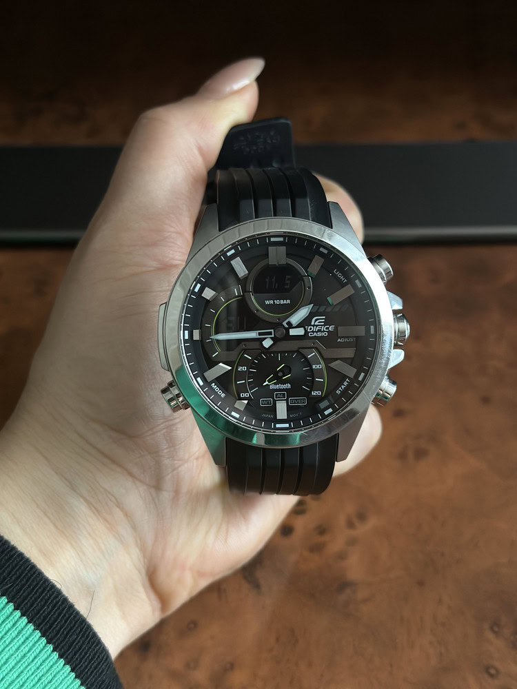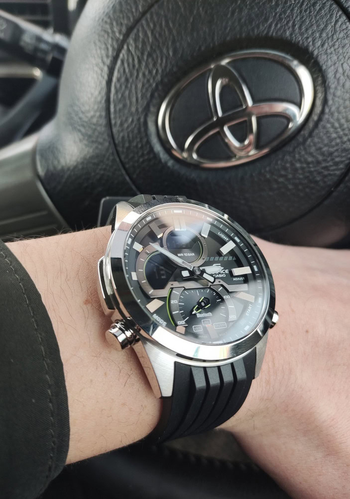 • Двойная автоматическая светодиодная подсветка. Двойная подсветка обеспечивает освещение цифрового дисплея и всего циферблата, что облегчает считывание информации. При повороте часов в сторону лица подсвечивание дисплея осуществляется автоматически, благодаря функции «Автоподсветка». Продолжительность подсветки можно изменять. Функция задержки отключения - подсветка горит еще несколько секунд после отпускания кнопки освещения.