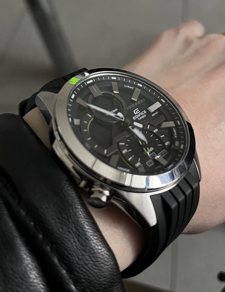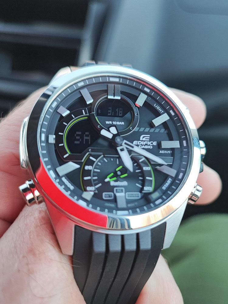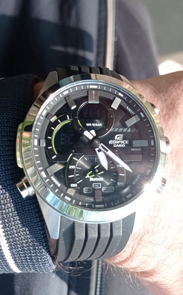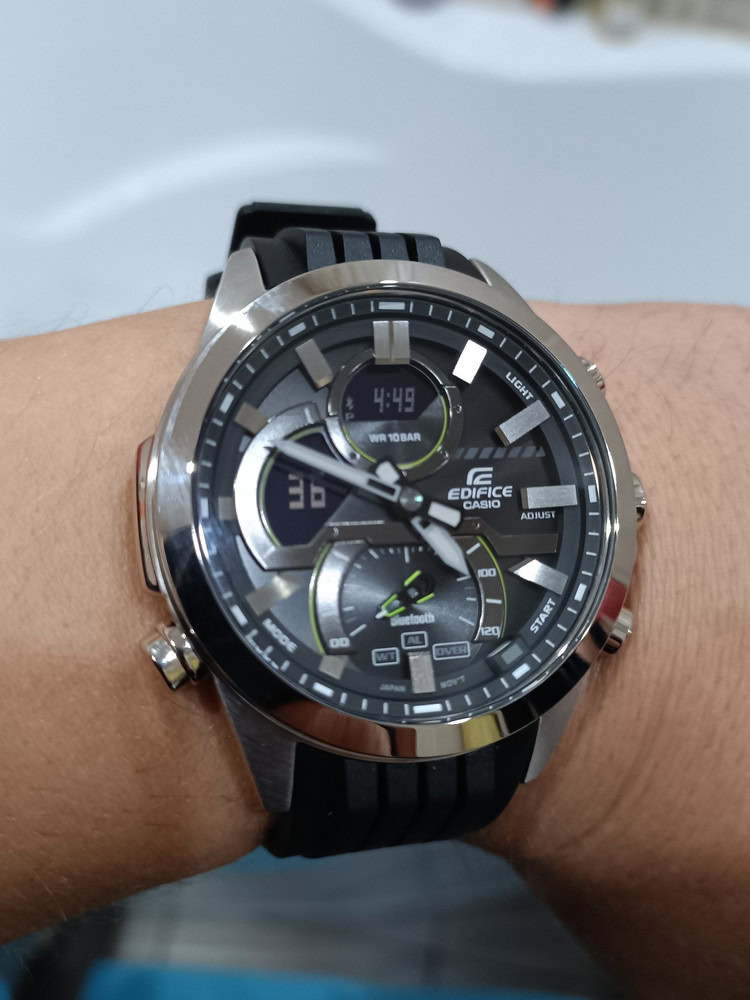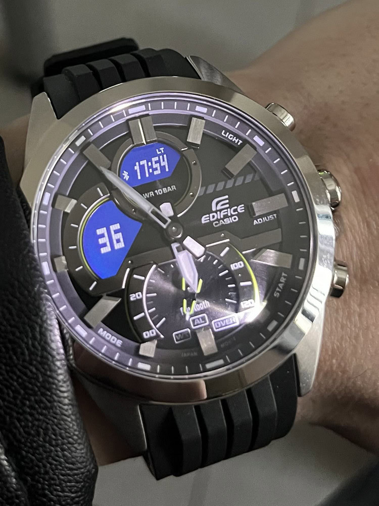 • Двойная автоматическая светодиодная подсветка. Двойная подсветка обеспечивает освещение цифрового дисплея и всего циферблата, что облегчает считывание информации. При повороте часов в сторону лица подсвечивание дисплея осуществляется автоматически, благодаря функции «Автоподсветка». Продолжительность подсветки можно изменять. Функция задержки отключения - подсветка горит еще несколько секунд после отпускания кнопки освещения.