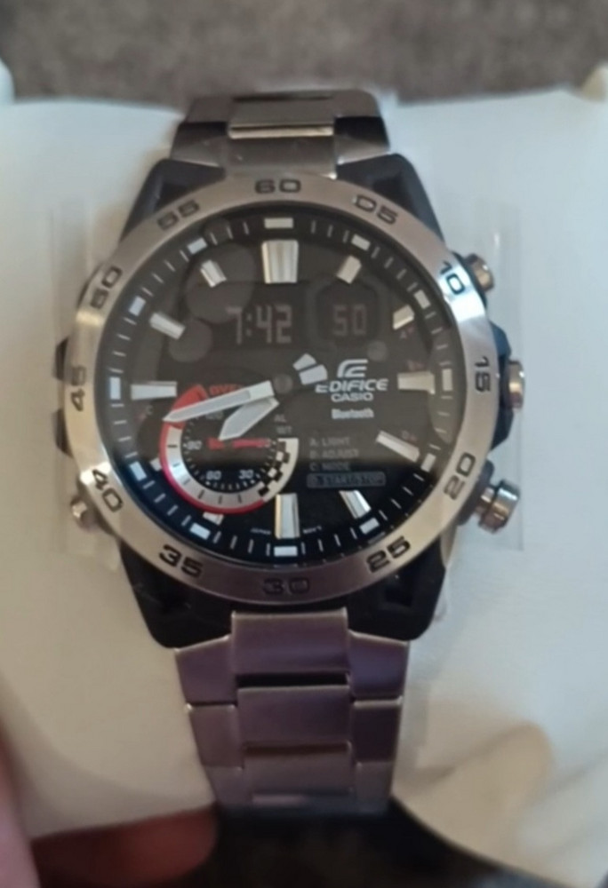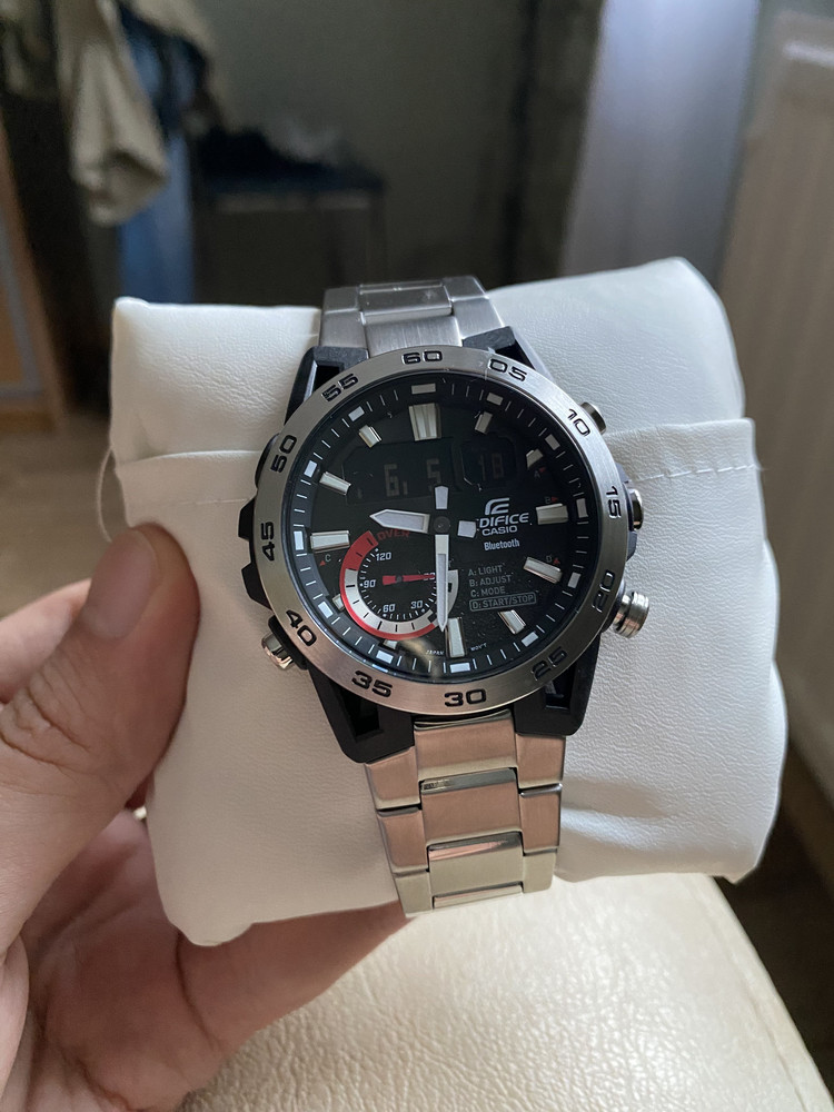 Мужские наручные часы Casio Edifice ECB-40D-1A. Точный кварцевый механизм с аналого-цифровой индикацией. Корпус изготовлен из высококачественной нержавеющей стали 316L с высокими антикоррозийными свойствами. Светодиодная подсветка. На циферблате отображается текущее число, месяц и день недели. Функция Bluetooth позволяет удобно отображать все метрики с часов на экране смартфона, а также выводить на часы уведомления о входящих звонках, сообщениях и имейлах. Функция хронографа. Для подсветки дисплея используется светодиод, а так же имеет функцию автоматического включения подсветки, если Вы наклоните часы к своему лицу. Функция будильника. Аккумулятор обеспечивает часы достаточным питанием приблизительно на 2 года. Отображение текущего времени в основных городах и конкретных областях по всему миру. После настройки автоматический календарь всегда отображает точную дату. Отображение времени возможно в 12-часовом или 24-часовом формате. Браслет из нержавеющей стали. Прочное, устойчивое к царапинам минеральное стекло защищает часы от повреждений. Часы являются водонепроницаемыми до 10 Бар. Цвет корпуса: Серый. Цвет циферблата: Серый. Ширина (с заводной головкой): 52мм. Толщина: 13мм. Гарантия: 2 года. Другие наименования модели: ECB-40D-1ADF.