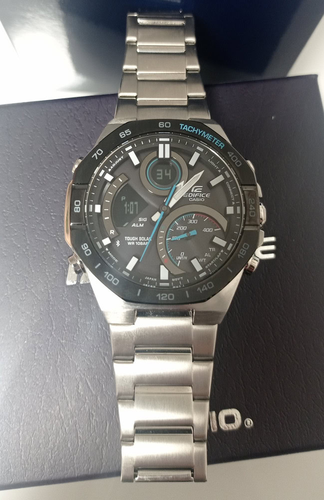 Мужские наручные часы Casio Edifice ECB-950DB-1A. Точный кварцевый механизм с аналоговой индикацией. Корпус изготовлен из высококачественной нержавеющей стали 316L с высокими антикоррозийными свойствами. Светодиодная подсветка. На циферблате отображается текущее число месяца и день недели. Ударопрочная конструкция часов защищает от ударов и вибрации. Солнечная батарейка. Солнечная подзаряжающаяся батарейка обеспечивает питание часов для работы. Функция Bluetooth позволяет удобно отображать все метрики с часов на экране смартфона, а также выводить на часы уведомления о входящих звонках, сообщениях и имейлах. Функция хронографа. Функция таймера. Таймеры обратного отсчета напомнят Вам о текущих или особенных событиях, издав звуковой сигнал в установленное время. Функция будильника. Индикатор запаса хода. Отображение текущего времени в основных городах и конкретных областях по всему миру. После настройки автоматический календарь всегда отображает точную дату. Отображение времени возможно в 12-часовом или 24-часовом формате. Браслет из нержавеющей стали. Прочное, устойчивое к царапинам минеральное стекло защищает часы от повреждений. Часы являются водонепроницаемыми до 10 Бар. Цвет корпуса: Черный. Цвет циферблата: Черный. Ширина (с заводной головкой): 51мм. Толщина: 14мм. Гарантия: 2 года. Другие наименования модели: ECB-950DB-1AEF.