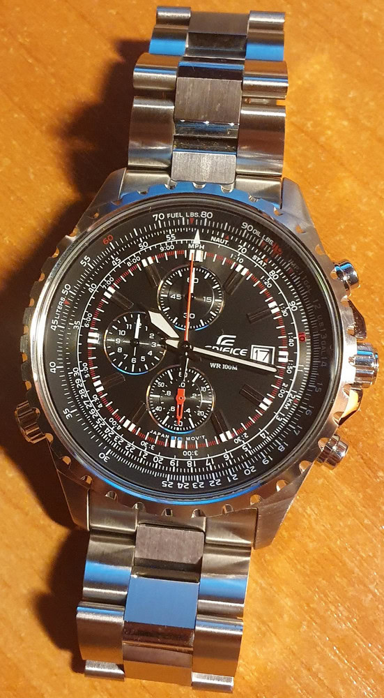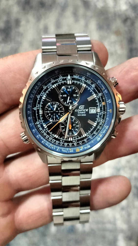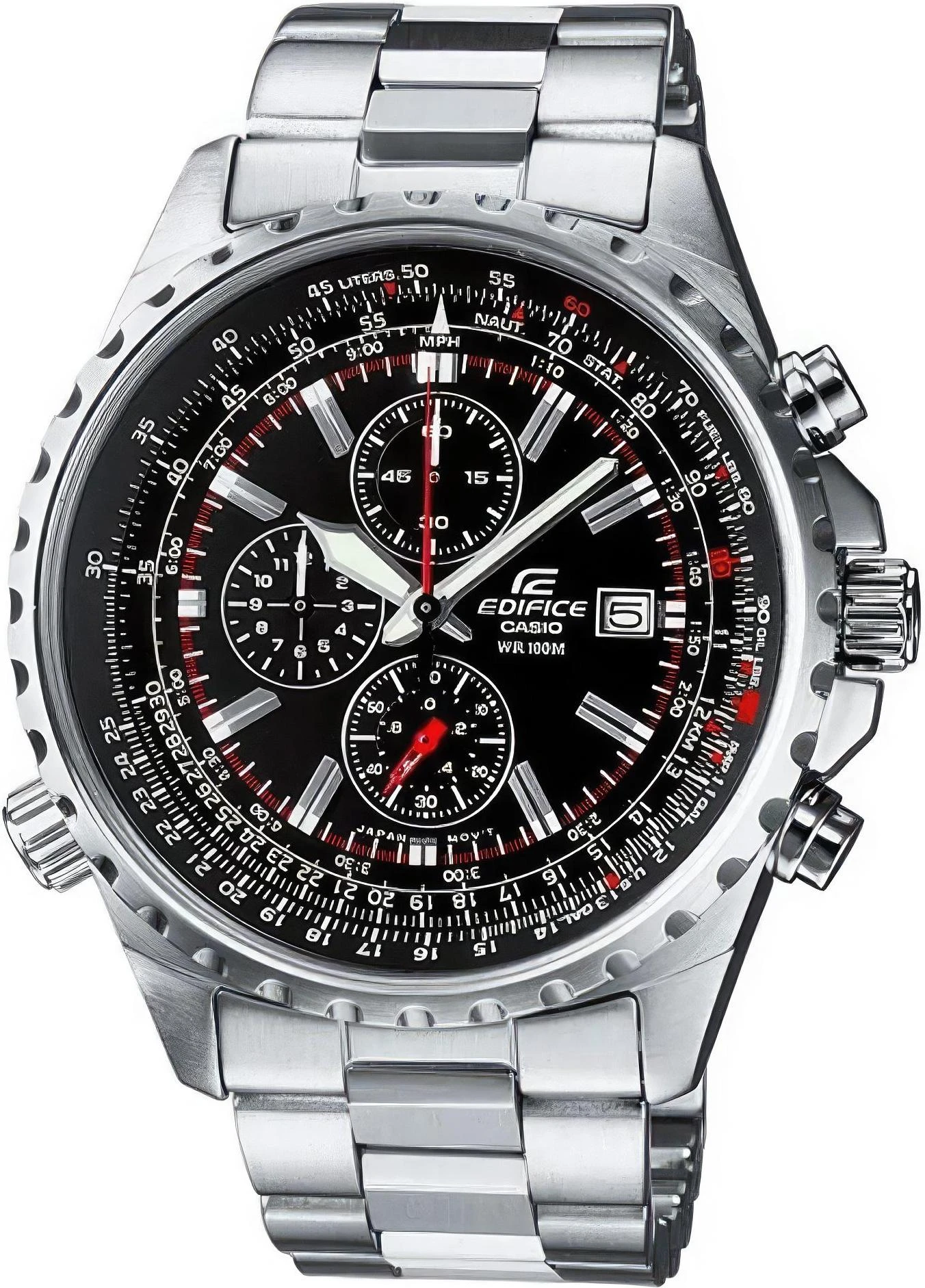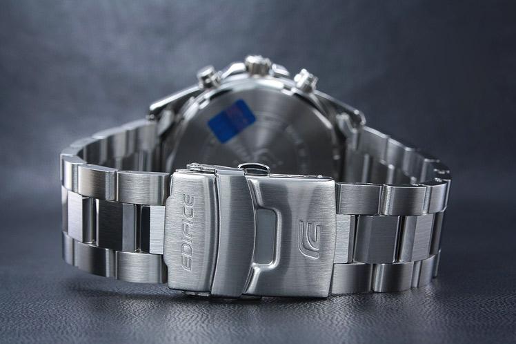 Мужские часы из серии Edifice Chronograph. Круглый корпус и литой браслет из нерж. стали. Минеральное стекло. Завинчивающаяся задняя крышка и переводная коронка. Вращающаяся логарифмическая шкала на циферблате. Точный кварцевый механизм с хронографом