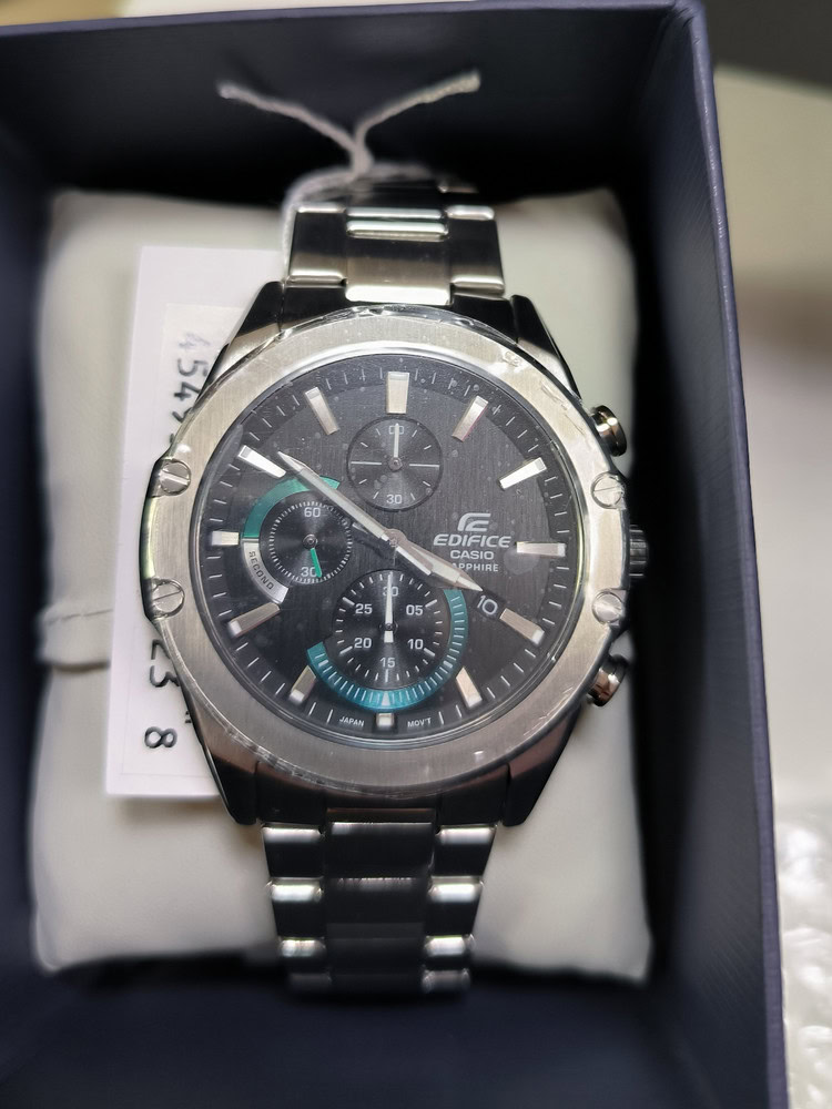 Часы выполнены из нержавеющей стали, модель EFR-S567D-1A имеет циферблат графитового цвета с бирюзовыми акцентами, а модель EFR-S567D-2A имеет синий циферблат с серебряными акцентами в тон. Черный корпус и браслет модели EFR-S567DC-1A имеет ионное покрытие.