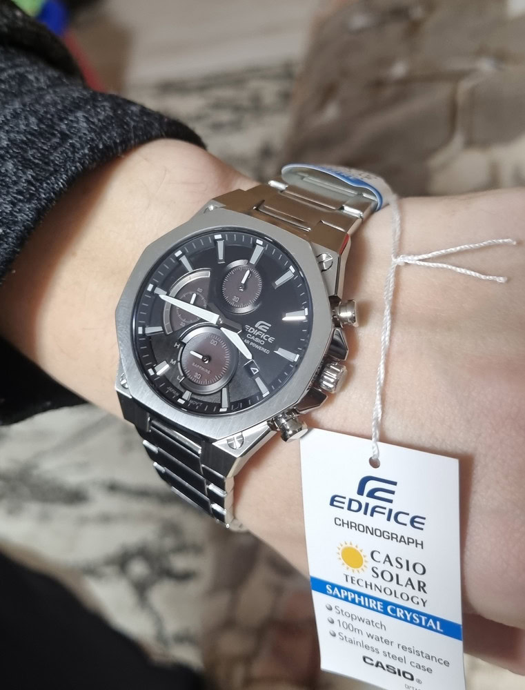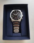 Спортивный хронограф с сапфировым стеклом. Черное покрытие корпуса и браслета. Питание от солнечных элементов. Стрелочный индикатор уровня заряда батареи.