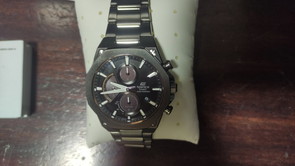 Спортивный хронограф с сапфировым стеклом. Черное покрытие корпуса и браслета. Питание от солнечных элементов. Стрелочный индикатор уровня заряда батареи.