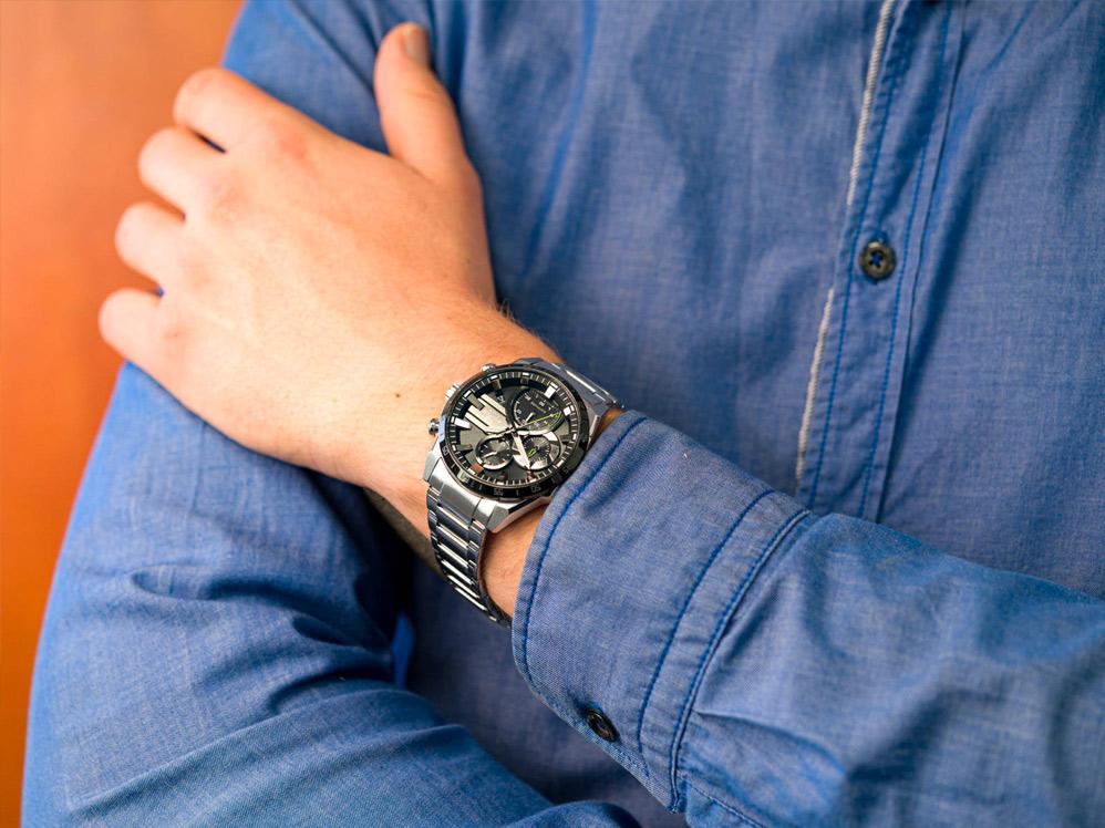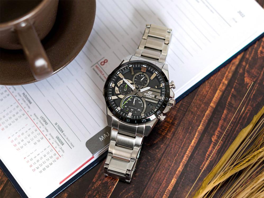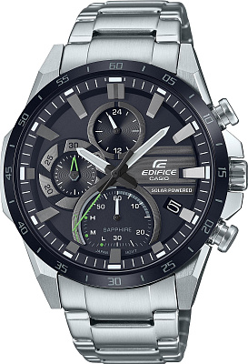 Хронограф на солнечной батарее с динамичным трехмерным дизайном циферблата. Полная зарядка обеспечивает работу часов в течение пяти месяцев. Яркие линии, подчеркивающие циферблат, создают спортивный образ. Edifice. Питание от солнечной энергии, индикатор уровня зарядки батареи. Время работы аккумулятора без подзарядки приблизительно 5 месяцев. Необритовое светонакопительное покрытие обеспечивает длительное послесвечение в темноте даже после кратковременного нахождения на свету. Часы-хронограф с секундомером с точностью показаний 1с и временем измерения 30мин. 12-ти и 24-х часовой формат времени. Циферблат с метками в виде штрихов выполнен по технологии Sunray (солнечные лучи). Окошко даты находится в положении 4 часа. Заводная головка с защитой. Задняя крышка с винтовым фиксатором. Водонепроницаемость в соответствии с ISO 2281. Стальной браслет с надежным замком расстегиваемым одним касанием.