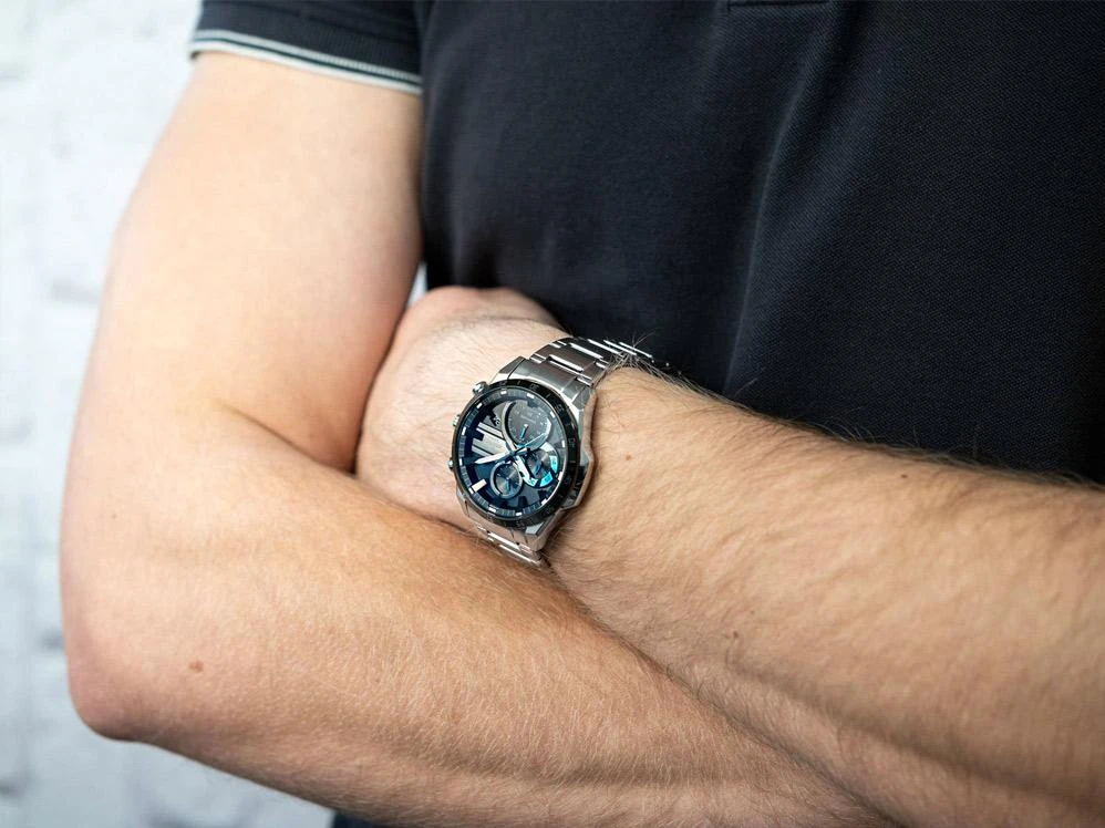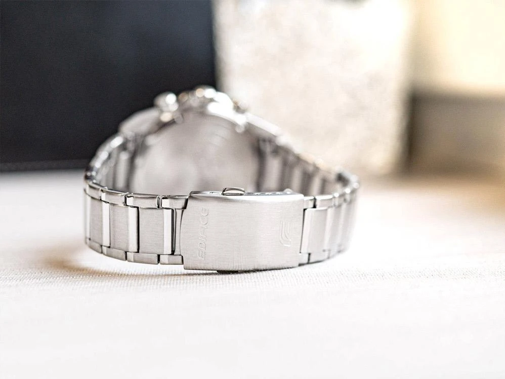 Хронограф на солнечной батарее с динамичным трехмерным дизайном циферблата. Полная зарядка обеспечивает работу часов в течение пяти месяцев. Яркие линии, подчеркивающие циферблат, создают спортивный образ. Edifice. Питание от солнечной энергии, индикатор уровня зарядки батареи. Время работы аккумулятора без подзарядки приблизительно 5 месяцев. Необритовое светонакопительное покрытие обеспечивает длительное послесвечение в темноте даже после кратковременного нахождения на свету. Часы-хронограф с секундомером с точностью показаний 1с и временем измерения 30мин. 12-ти и 24-х часовой формат времени. Циферблат с метками в виде штрихов выполнен по технологии Sunray (солнечные лучи). Окошко даты находится в положении 4 часа. Заводная головка с защитой. Задняя крышка с винтовым фиксатором. Водонепроницаемость в соответствии с ISO 2281. Стальной браслет с надежным замком расстегиваемым одним касанием.