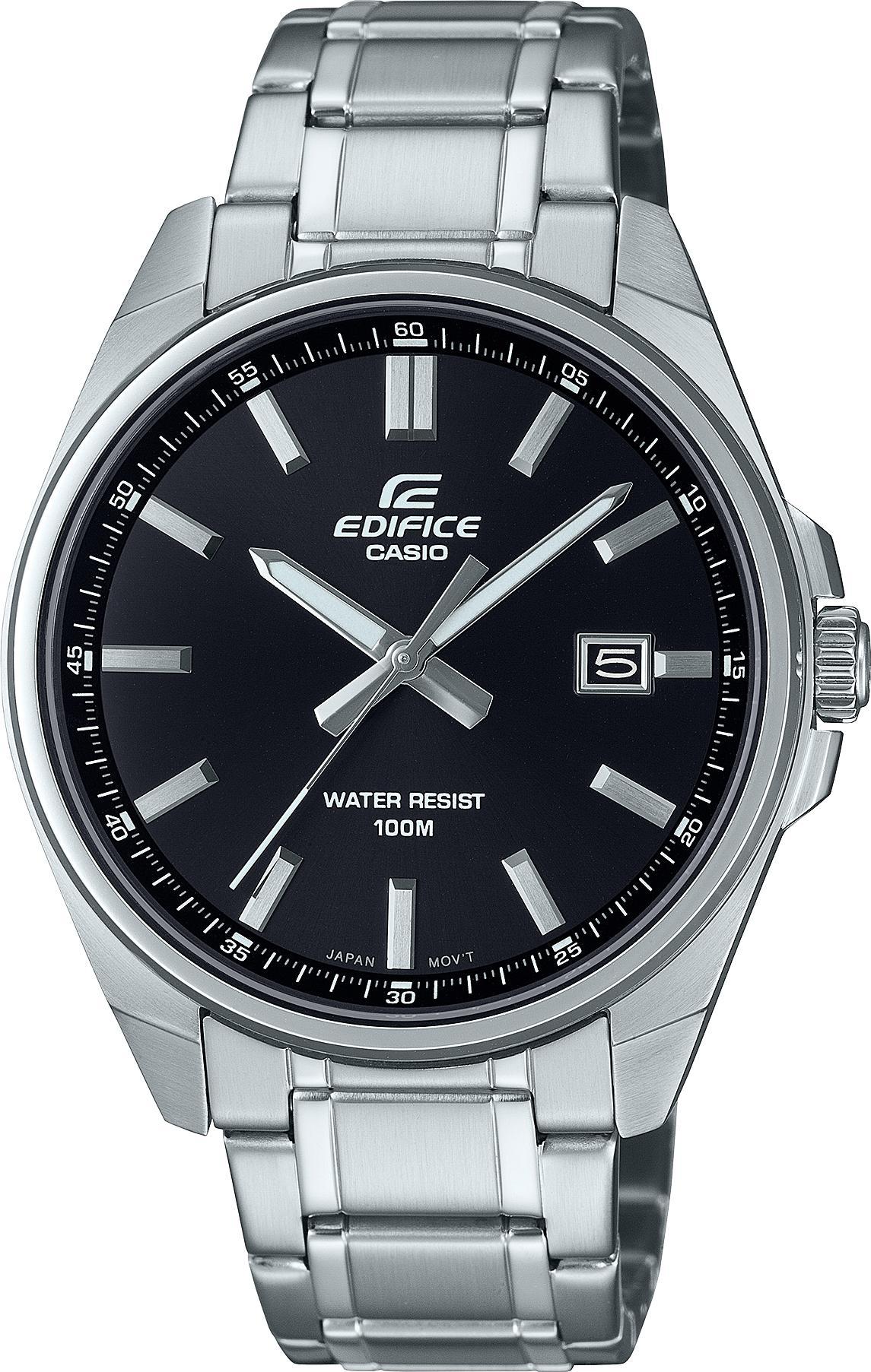 Мужские наручные часы Casio Edifice EFV-150D-1A. Точный кварцевый механизм с аналоговой индикацией. Корпус изготовлен из высококачественной нержавеющей стали 316L с высокими антикоррозийными свойствами. На стрелки и отметки нанесен светонакопительный состав, благодаря этому считывать информацию с циферблата возможно и в темноте. На циферблате отображается текущее число месяца. Батарейка на 3 года. Браслет из нержавеющей стали. Прочное, устойчивое к царапинам минеральное стекло защищает часы от повреждений. Часы являются водонепроницаемыми до 10 Бар. Цвет корпуса: Серебристый. Цвет циферблата: Черный. Ширина (с заводной головкой): 43мм. Толщина: 9мм. Гарантия: 2 года. Другие наименования модели: EFV-150D-1AVUDF, EFV-150D-1AVD.
