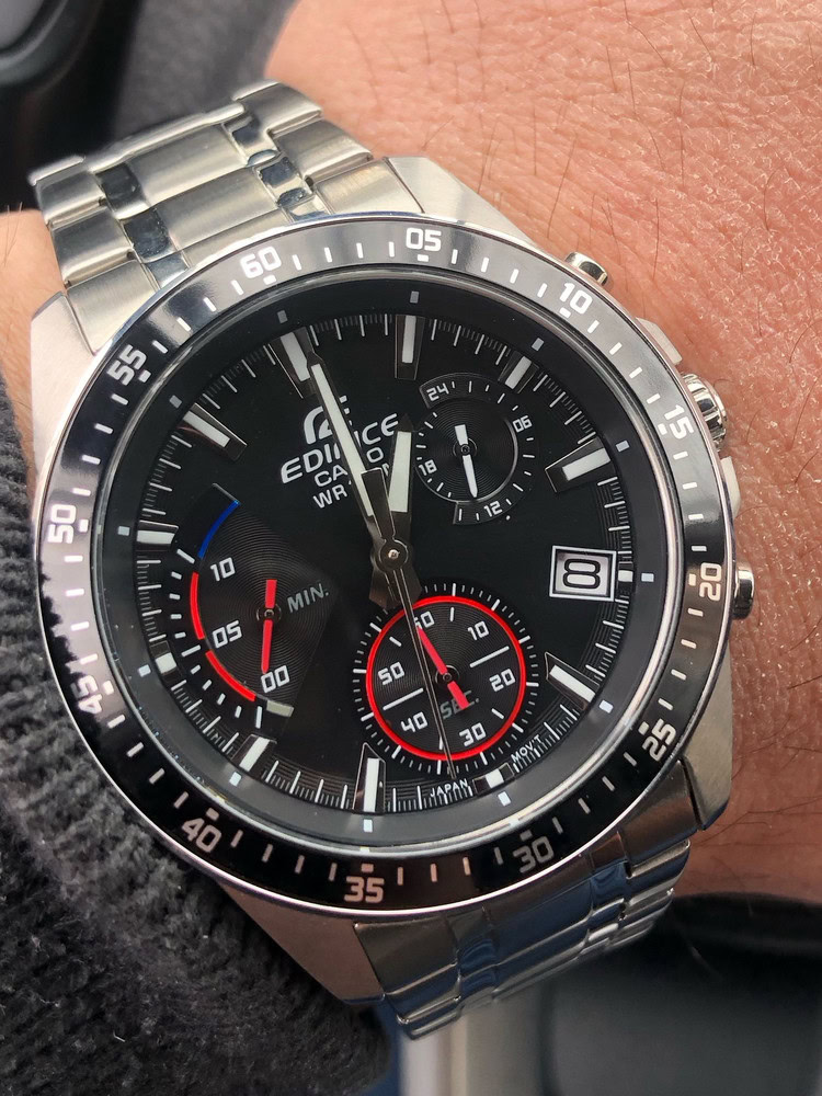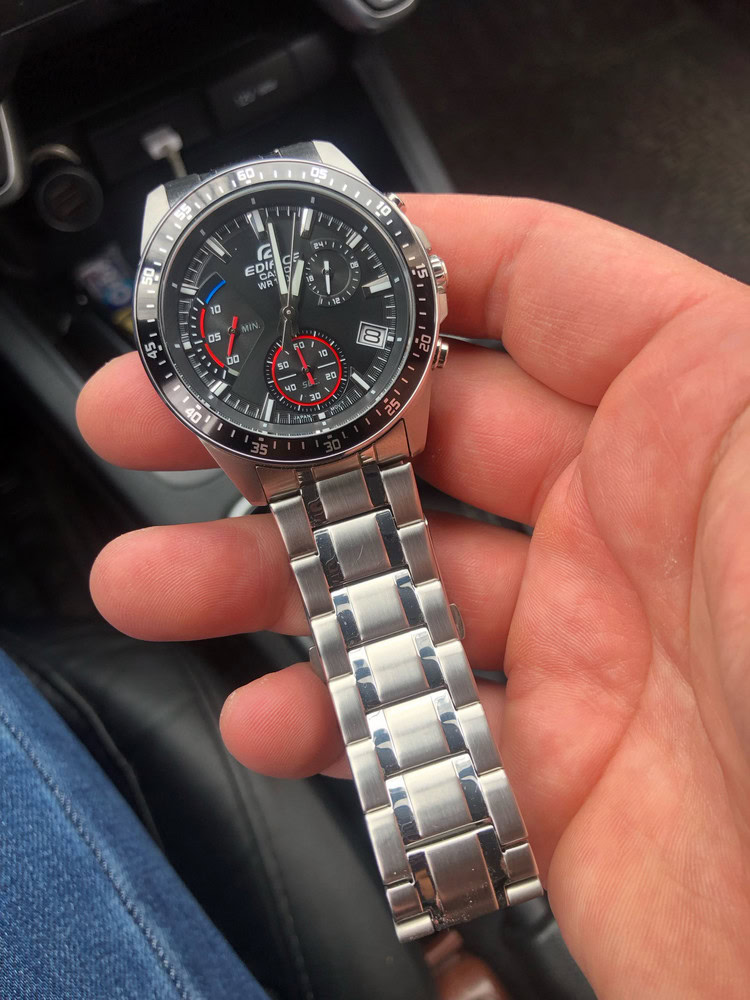 Выбирал между классикой и спортивными, а тут два в одном, небольшие, аккуратные, черные, тяжёленькие, браслет сам укорачивал тупым концом иголки с молоточком - там обычные штифты, стрелка на 10 минутном индикаторе чуть ниже нулей стояла, на маленьком 60 секундном индикаторе при отжатой на 2 щелчка головке кнопкой промотал посекундно на минуту вперёд и зафиксировал, проверил, 10 минут таймер идёт и плавно сбрасывается, так что всё отлично, ход замерял за 5 дней почти в секунду идут, на 0.3 - 0.4 примерно спешат, это в месяц не больше 3 секунд ( в описании указано +/-20 в месяц) так что неплохо, на коробку пупырки намотали порядочно, до Ульяновска 2 дня ехали, так что моя доволен! Радость)