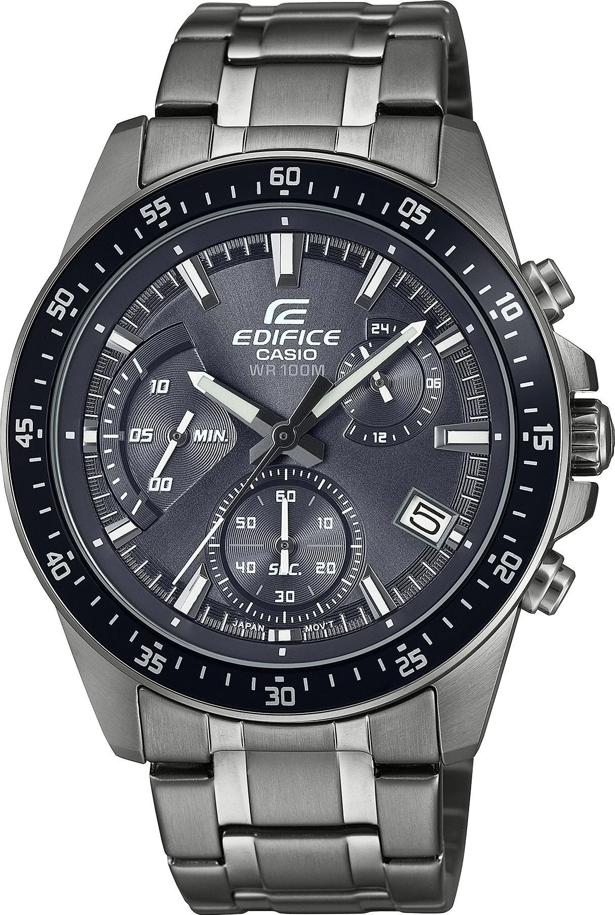 Мужские наручные часы Casio Edifice EFV-540DC-1C. Точный кварцевый механизм с аналоговой индикацией. Браслет из нержавеющей стали. Функция хронографа. Браслет из нержавеющей стали. Прочное, устойчивое к царапинам минеральное стекло защищает часы от повреждений. На циферблате отображается текущее число месяца. Часы являются водонепроницаемыми до 10 Бар. Цвет циферблата: Серый. Цвет корпуса: Серый. На стрелки и отметки нанесен светонакопительный состав, благодаря этому считывать информацию с циферблата возможно и в темноте. Высота (с ушками): 49 мм. Толщина: 12 мм. Гарантия: 2 года.