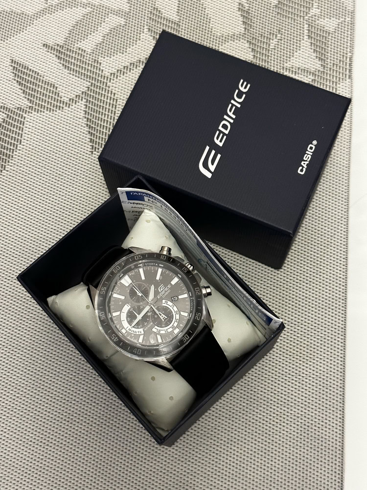 Мужские кварцевые часы с хронографом из серии Edifice Chrono. Круглый стальной корпус с частичным PVD покрытием черного цвета. Черный циферблат с метками в виде штрихов. Минеральное стекло. Водозащита 100м. Стальной браслет с раскладывающимся замком.