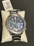 Мужские кварцевые часы с хронографом из серии Edifice Chrono. Круглый корпус из нержавеющей стали. Синий циферблат с метками в виде штрихов. Минеральное стекло. Водозащита 100 м. Стальной браслет с раскладывающимся замком.