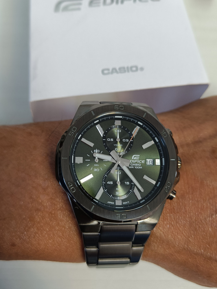 Мужские наручные часы Casio Edifice EFV-640DC-3A. Точный кварцевый механизм с аналоговой индикацией. Корпус изготовлен из высококачественной нержавеющей стали 316L с высокими антикоррозийными свойствами. На стрелки и отметки нанесен светонакопительный состав, благодаря этому считывать информацию с циферблата возможно и в темноте. На циферблате отображается текущее число месяца. Функция хронографа. Аккумулятор обеспечивает часы достаточным питанием приблизительно на 2 года. Отображение времени возможно в 12-часовом или 24-часовом формате. Браслет из нержавеющей стали. Прочное, устойчивое к царапинам минеральное стекло защищает часы от повреждений. Часы являются водонепроницаемыми до 10 Бар. Цвет корпуса: Черный. Цвет циферблата: Зеленый. Ширина (с заводной головкой): 47мм. Толщина: 11мм. Гарантия: 2 года. Другие наименования модели: EFV-640DC-3AVUDF.