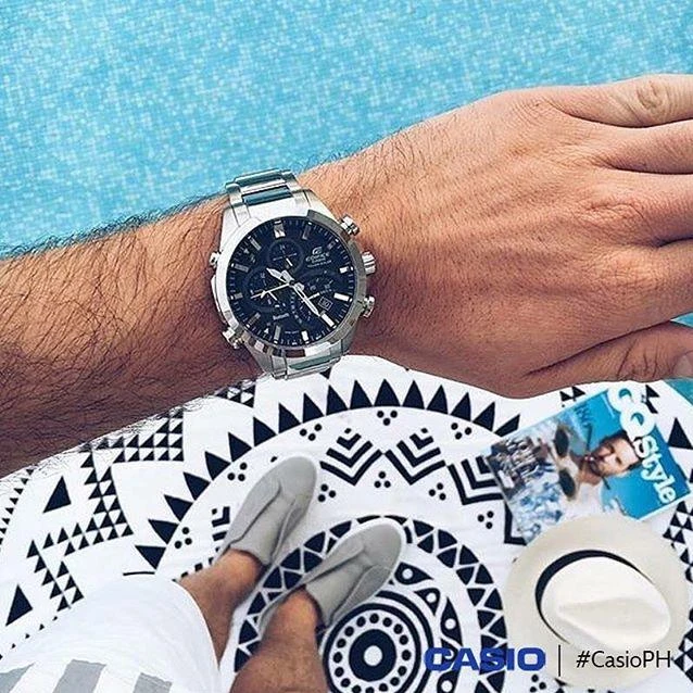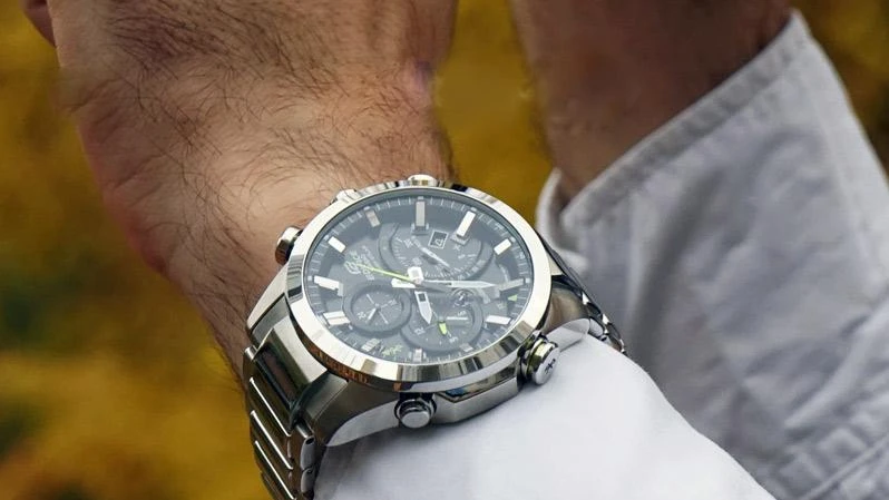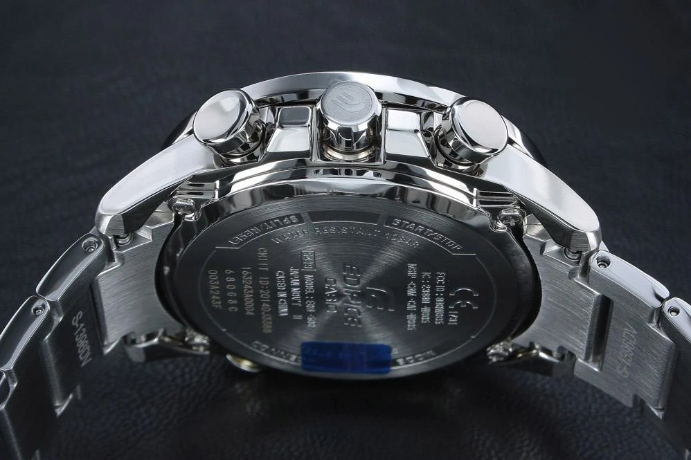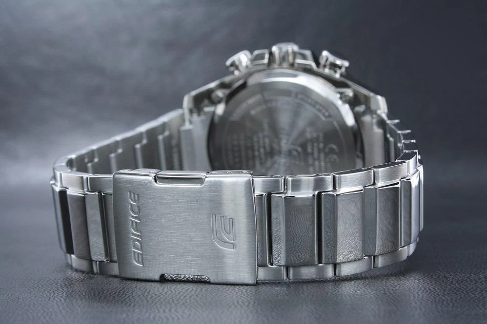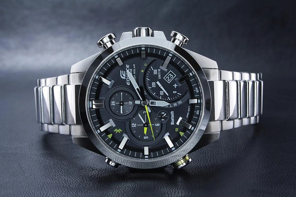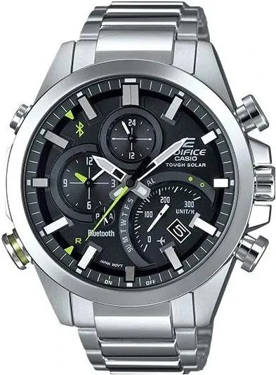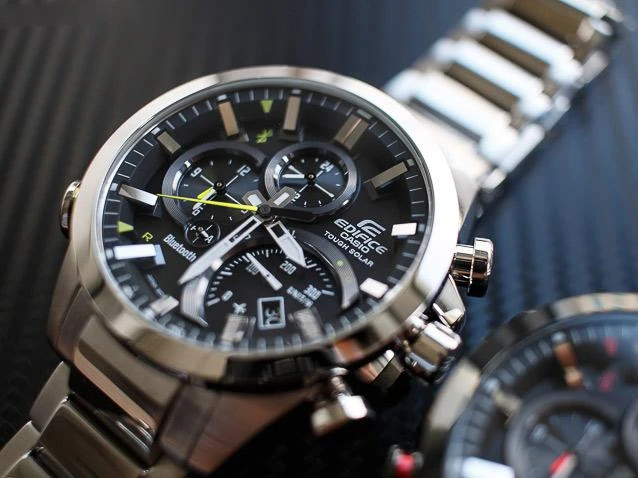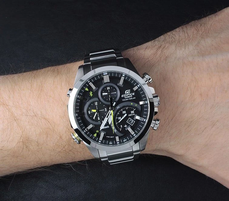 <b>Японские часы с внушительным дизайном предназначены для современных мужчин. Синхронизация со смартфоном по Bluetooth, одновременное отображение времени 2 часовых поясов. Многофункциональный кварцевый механизм на солнечных батареях, индикатор скорости</b><br><br>Многофункциональный кварцевый механизм, модуль 5519, с возможностью обмена данными со смартфонами по беспроводному каналу связи Bluetooth 4.0. Точность хода без подстройки времени с погрешность не более +/- 15 сек в месяц. Работа от солнечных батарей, встроенных в циферблат часов. Перезаряжаемая аккумуляторная батарея тип CTL1616. При полном заряде аккумулятора часы работают без доп. подзарядки в течение 8 месяцев и 34 месяцев сохраняют данные в спящем режиме. Функции:<br>• Синхронизация со смартфонам по технологии Bluetooth 4.0.<br>• Совместимость с мобильным приложением CASIO WATCH+.<br>• Моментальная коррекция времени в соответствии с теперешним местоположением владельца.<br>• Поиск смартфона «Phone Finder».<br>• Авиарежим (режим оффлайн) – прекращение обмена данными между часами и синхронизированным смартфоном.<br>• Установка мирового времени в любом из 300 городов в различных часовых поясах Земли<br>• Одновременное отображение текущего времени в двух разных часовых поясах.<br>• Ежедневный будильник.<br>• Индикатор скорости на заданном отрезке (при подключении к мобильному приложению можно отобразить время до 100 кругов с точностью 1/1000 секунды).<br>• Автоматический календарь не требует дополнительной коррекции и учитывает число дней в каждом из месяцев вплоть до 2100 года.<br><br>Дизайн корпуса соответствует современному динамичному стилю и выполнен с должной солидностью. Технические характеристики:<br>• Корпус выполнен из нержавеющей стали 316L, поверхность с матовой шлифовкой (сатинирование) и глянцевой полировкой.<br>• Стойкое IP-покрытие черного цвета.<br>• Ширина корпуса 48,1 мм, высота – 52 мм, толщина - 14,2 мм. Вес 199 грамм.<br>• Минеральное стекло устойчивое к возникновению царапин.<br>• Безель – контрастный, с черным IP-покрытием и гравированной тахиметрической шкалой.<br>• Объемный многоуровневый циферблат с насыщенным дизайном и яркими акцентами, аппликация объемных часовых меток 3D.<br>• Необритовая люминесцентная подсветка на стрелках и индексах часа.<br>• Винтовое соединение задней крышки и переводной коронки с корпусом.<br>• Водонепроницаемость до 100 метров (10 АТМ).<br>• Браслет с литыми звеньями из нержавеющей стали, раскладывающаяся застежка при нажатии на 2 боковых кнопки.