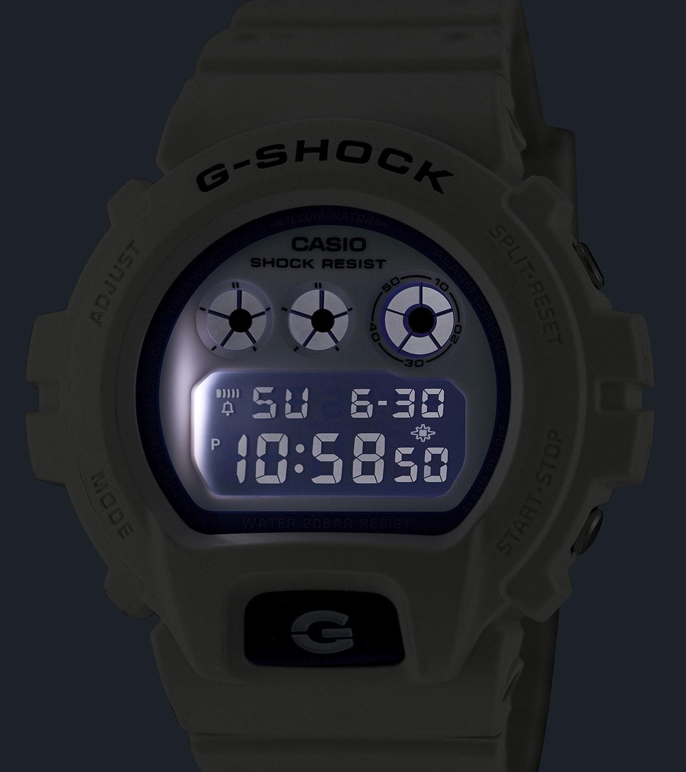Вдохновитесь летними морями с бело-синими часами G-SHOCK. Синий фосфоресцирующий циферблат часов волшебно светится ночью, напоминая мерцание биолюминесцентного планктона, плавающего в море. В сочетании с бело-синей цветовой гаммой дизайн прекрасно передает динамичное преображение пляжа от яркого дневного солнца до мягких ночных оттенков. Мерцающие модели, вдохновленные морем, легко впишутся как в повседневную обстановку, так и в деловые ситуации.