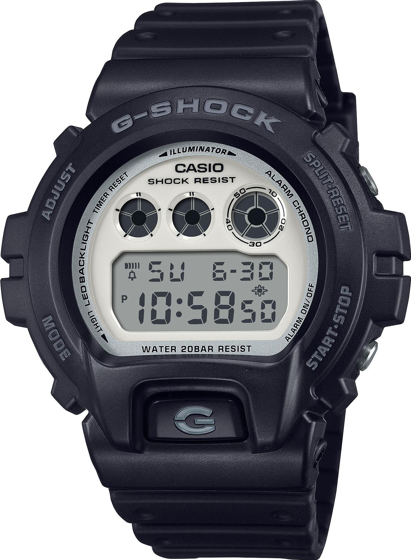 Мужские наручные часы Casio G-Shock DW-6900WD-1E. Точный кварцевый механизм с цифровой индикацей. Полимерный ремешок. Натуральный полимерный материал является идеальным для изготовления ремешка благодаря своей чрезвычайной прочности и гибкости. Ударопрочная конструкция часов защищает от ударов и вибрации. Функция будильника. Функция хронографа. Функция таймера. Таймеры обратного отсчета напомнят Вам о текущих или особенных событиях, издав звуковой сигнал в установленное время. Ежечасный сигнал. После настройки автоматический календарь всегда отображает точную дату. Отображение времени возможно в 12-часовом или 24-часовом формате. Аккумулятор обеспечивает часы достаточным питанием приблизительно на 5 лет. Полимерный ремешок. Натуральный полимерный материал является идеальным для изготовления ремешка благодаря своей чрезвычайной прочности и гибкости. Прочное, устойчивое к царапинам минеральное стекло защищает часы от повреждений. На циферблате отображается текущее число, месяц и день недели. Часы являются водонепроницаемыми до 20 Бар. Цвет циферблата: Черный. Цвет корпуса: Белый. Цвет корпуса: Серый. Светодиодная подсветка. Высота (с ушками): 53 мм. Толщина: 19 мм. Гарантия: 2 года.