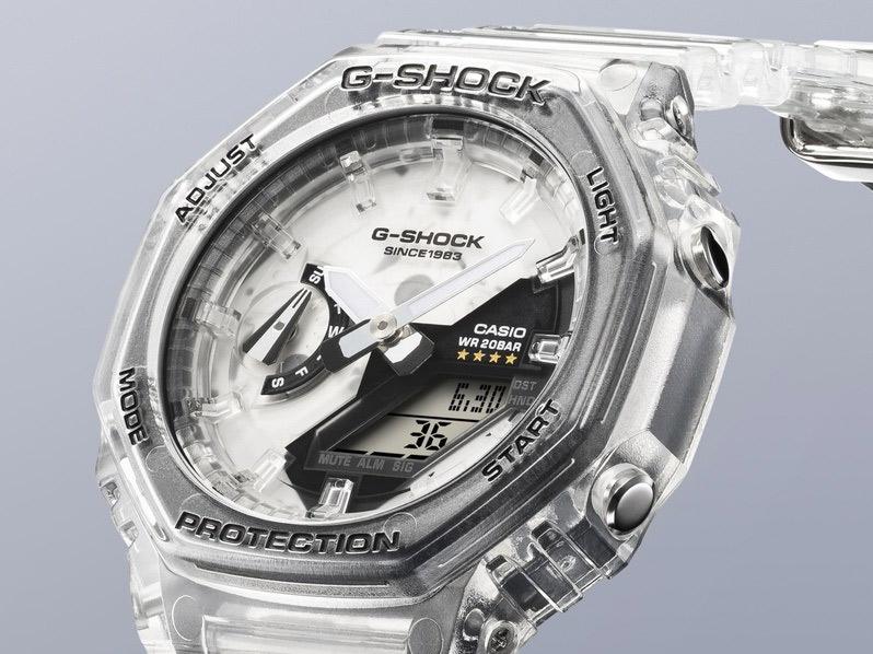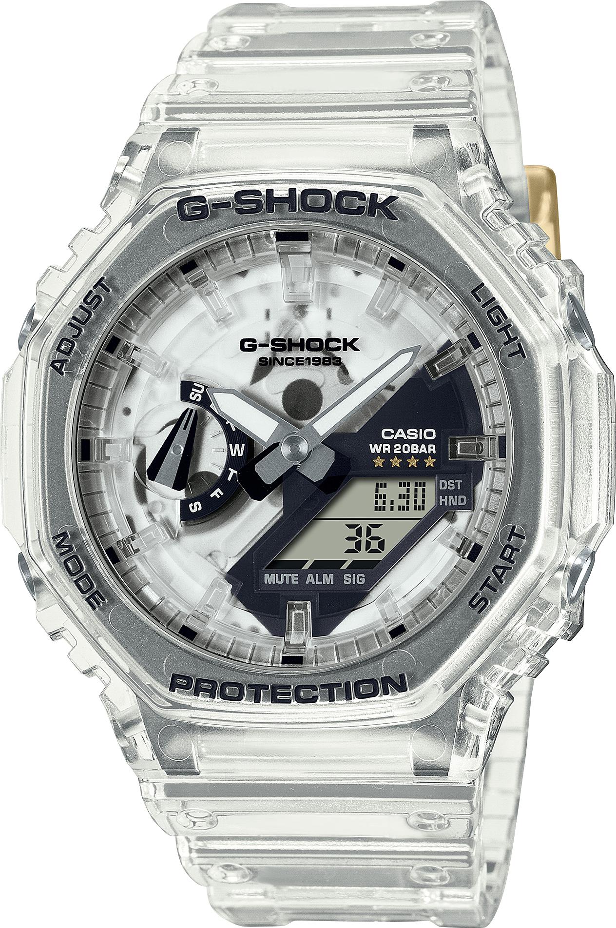 Перед вами лимитированная модель G-SHOCK из серии Clear Remix в популярном корпусе GA-2100, выпущенная в честь 40-летия бренда G-SHOCK. Модель выполнена в прозрачном полимерном корпусе с полупрозрачным циферблатом, на черной части которого можно заметить 4 золотые звезды — 4 десятилетия бренда, а под логотипом G-Shock надпись "Since 1983". Помимо супер харизматичного внешнего вида часы получили стальной держатель ремешка золотого цвета и гравировку задней крышки с лого юбилея бренда. Двойная светодиодная подсветка. Ударопрочность. Ударопрочная конструкция защищает от ударов и вибрации. Светящееся покрытие обеспечивает длительную подсветку в темное время суток после короткого воздействия света. Отображение текущего времени в основных городах и конкретных областях по всему миру. Функция секундомера- 1/100 сек. - 24 часа. Прошедшее время измеряется с точностью в 1/100 секунды. Пределы измерения достигают 24 часов. Таймер - 1/1 сек. - 24 часа. 5 ежедневных будильников.