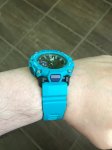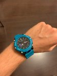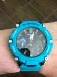 Мужские кварцевые часы с аналого-цифровым вариантом отображения времени из серии G-Shock. Круглый карбоновый корпус голубого цвета. Черный циферблат. Минеральное стекло. Водозащита 200 м. Голубой пластиковый ремешок с классической пряжкой.
