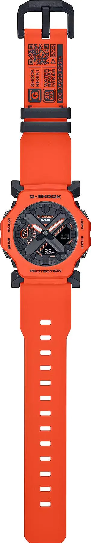 Новинка ударопрочных часов G-Shock - надежность, которая никогда не подведет в нужную минуту. G-Shock. Мужские часы. Корпус и ремешок выполнены из биопластика, который изготавливается из возобновляемых органических ресурсов. Противоударный корпус защищает механизм от ударов и вибрации. Двойная подcветка: циферблат и ЖК-дисплеи подсвечиваются светодиодом, благодаря наличию функции задержки, после отпускания кнопки освещение горит еще несколько секунд. Настраиваемое послесвечение 1,5 или 3сек. Цвет подсветки: белый. Необритовое светонакопительное покрытие обеспечивает длительное послесвечение в темноте даже после кратковременного нахождения на свету. 12-ти и 24-х часовой формат времени. Секундомер с двумя точностями показаний: 1/100с (до 1ч) и 1с (после 1ч) и временем измерения 24ч. SPLIT-хронограф. Таймер обратного отсчета от 1с до 24ч. Мировое время – 48 городов (31 часовой пояс), всемирное координированное время (UTC). Функция включения/отключения летнего времени. Ретроградный указатель для недели. Функции отключения/включения звука и перемещения стрелок для беспрепятственного просмотра информации на цифровых дисплеях. Стальная задняя крышка крепится на 4-х винтах. Батарейка рассчитана на 3 года. Ремешок из полимерного материала с классической застежкой.