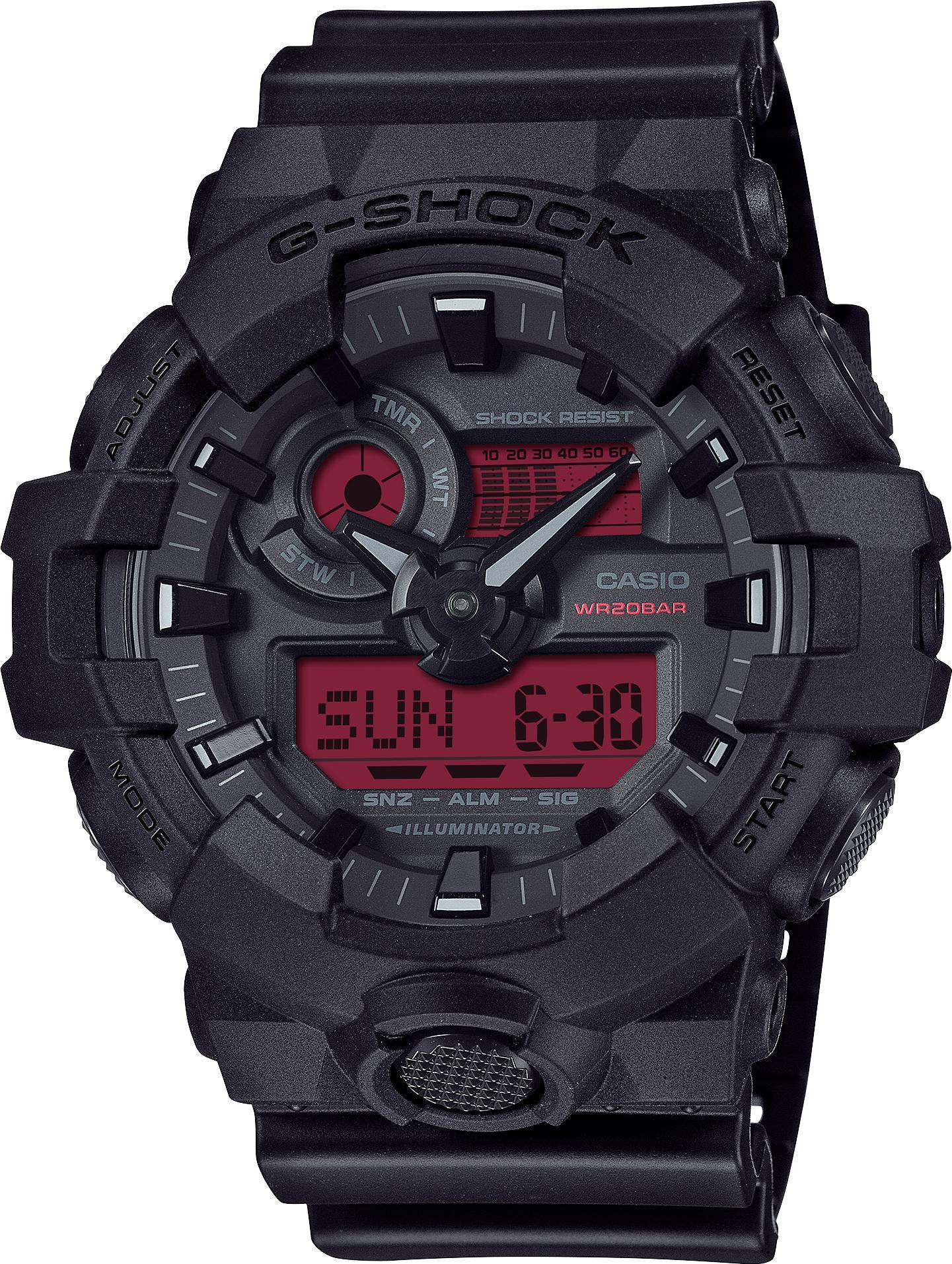 G-SHOCK в черно-красном исполнении: мощь и бескомпромиссный стиль. Яркий дисплей эффектно контрастирует с глубоким черным безелем, ремешком и цифербратом, создавая не только превосходную читаемость, но и подчеркивая бунтарский дух дизайна. Функция подсветки усиливает видимость цифрового дисплея даже в экстремальных условиях.