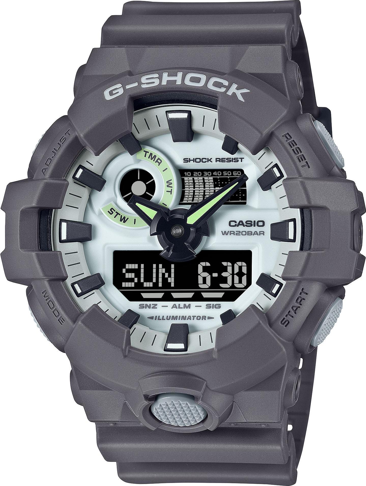 Мужские наручные часы Casio G-Shock GA-700HD-8A. Точный кварцевый механизм с аналого-цифровой индикацией. Полимерный ремешок. Натуральный полимерный материал является идеальным для изготовления ремешка благодаря своей чрезвычайной прочности и гибкости. После настройки автоматический календарь всегда отображает точную дату. Для подсветки дисплея используется светодиод, а так же имеет функцию автоматического включения подсветки, если Вы наклоните часы к своему лицу. Функция будильника. Ежечасный сигнал. Функция хронографа. Индикатор запаса хода. Отображение текущего времени в основных городах и конкретных областях по всему миру. Функция перемещения стрелок. Нажатие на кнопку обеспечит перемещение стрелок в такое положение, которое позволит Вам легко считать информацию с маленьких цифровых дисплеев – например, дату или показатели секундомера. Функция таймера. Таймеры обратного отсчета напомнят Вам о текущих или особенных событиях, издав звуковой сигнал в установленное время. Ударопрочная конструкция часов защищает от ударов и вибрации. Отображение времени возможно в 12-часовом или 24-часовом формате. Полимерный ремешок. Натуральный полимерный материал является идеальным для изготовления ремешка благодаря своей чрезвычайной прочности и гибкости. Прочное, устойчивое к царапинам минеральное стекло защищает часы от повреждений. Часы являются водонепроницаемыми до 20 Бар. Цвет циферблата: Серый. Цвет корпуса: Голубой. Светодиодная подсветка. Высота (с ушками): 58 мм. Толщина: 19 мм. Гарантия: 2 года.