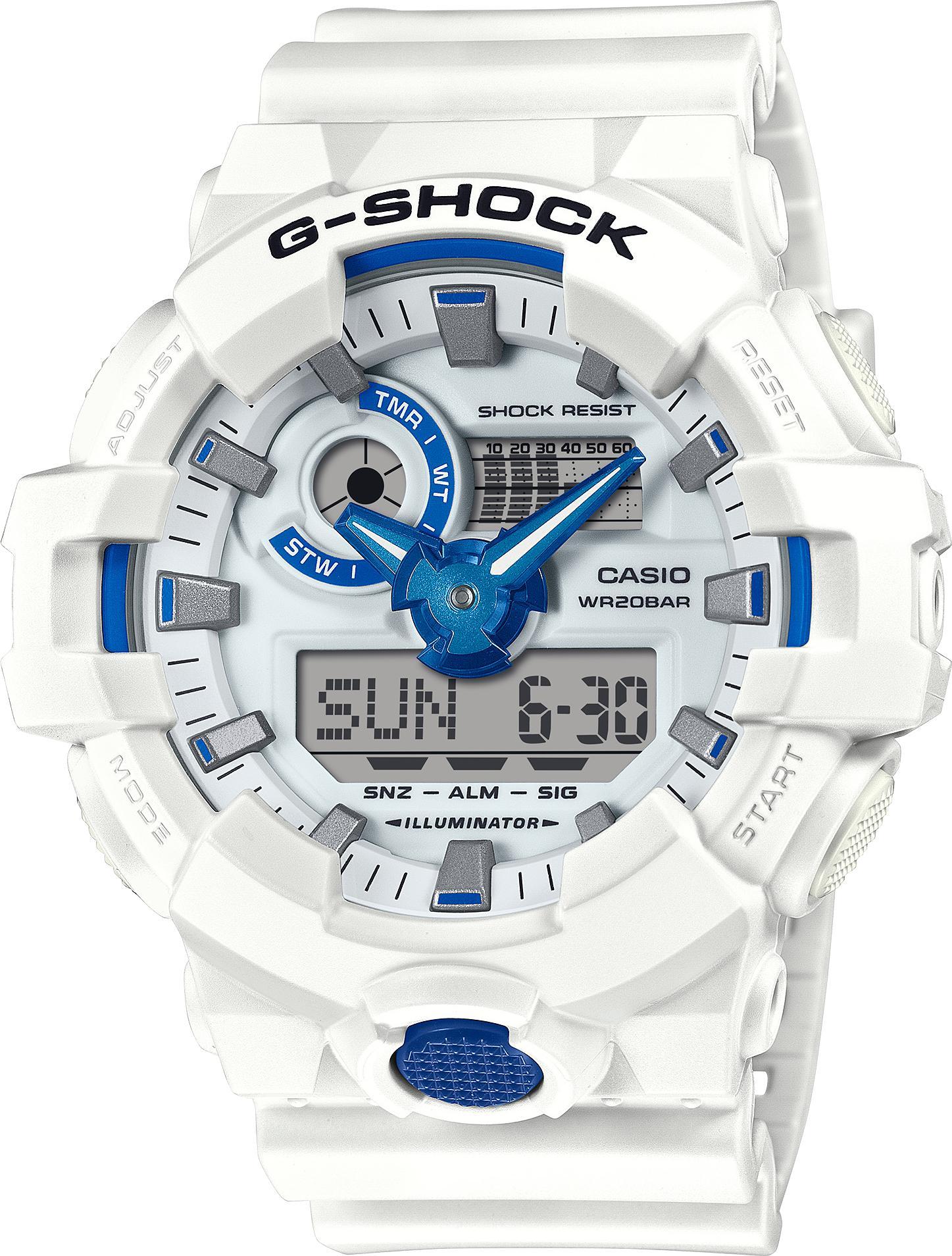 Вдохновение летним морем: бело-голубой G-SHOCK. Часы с фосфоресцирующим голубым циферблатом, который загадочно светится в темноте, напоминая мерцание морского планктона. Сочетание бело-голубой гаммы передает красоту прибрежного пейзажа — от ярких красок дня до мягких вечерних оттенков. Этот морской стиль легко сочетается как с повседневными, так и с деловыми образами, добавляя свежесть и легкость вашему образу.