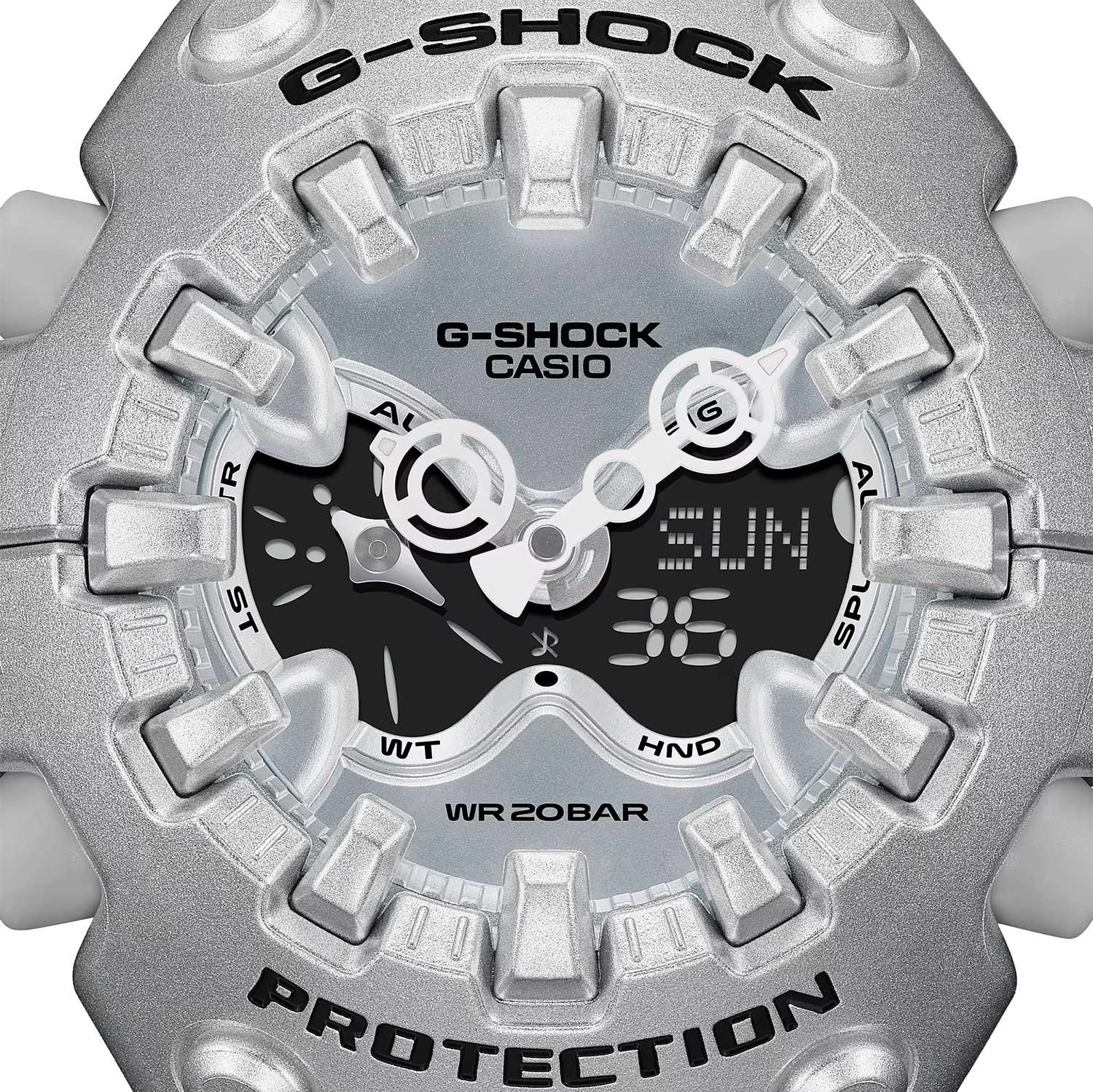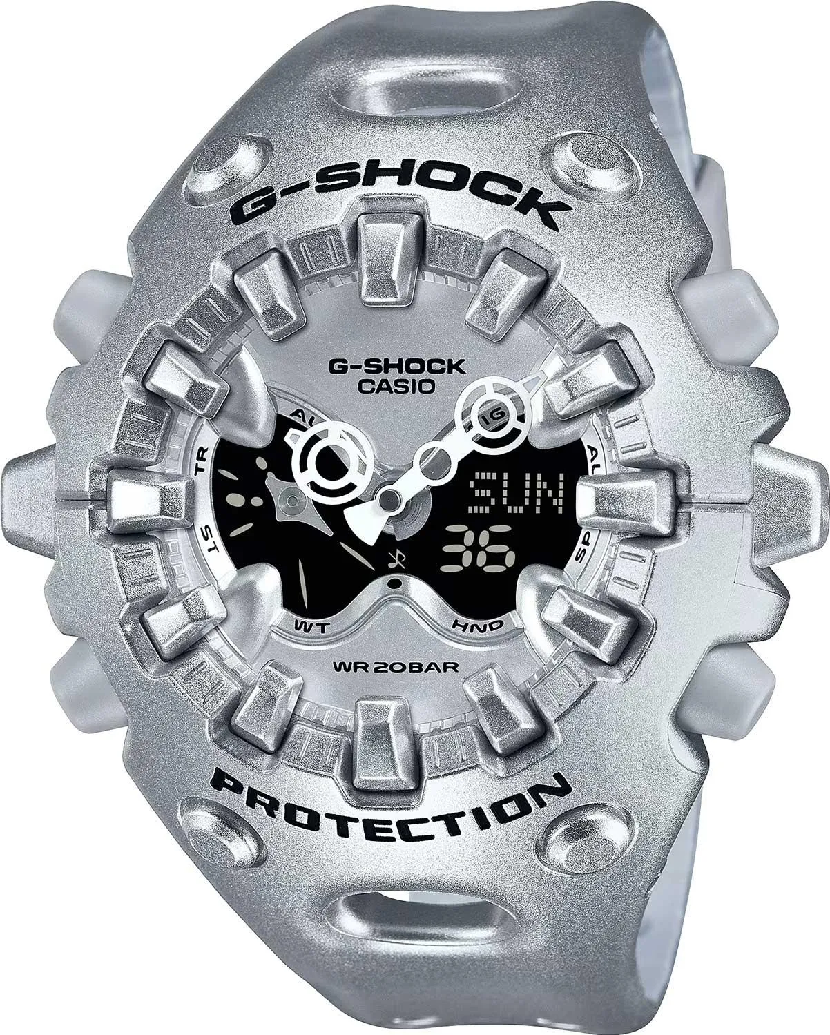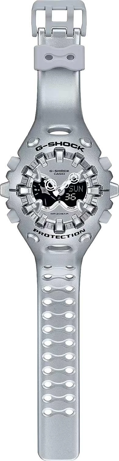 Casio G-Shock GA-V01A-8A с ярким футуристичным дизайном. Система собственной разработки Casio Shock Release Hand, в которой стрелки не крепятся к валу напрямую, а крепятся с помощью магнитного поля, что позволяет эффективно поглощать и рассеивать удары. Противоударный корпус защищает механизм от ударов и вибрации. Двойная подcветка: циферблат и ЖК-дисплеи подсвечиваются светодиодом, благодаря наличию функции задержки, после отпускания кнопки освещение горит еще несколько секунд. Настраиваемое послесвечение 1,5 или 3сек. Цвет подсветки: белый. Необритовое светонакопительное покрытие обеспечивает длительное послесвечение в темноте даже после кратковременного нахождения на свету. 12-ти и 24-х часовой формат времени. Секундомер с двумя точностями показаний: 1/100с (до 1ч) и 1с (после 1ч) и временем измерения 24ч. Секундомер с функцией SPLIT. Таймер обратного отсчета от 1с до 24ч. Мировое время – 48 городов (31 часовой пояс), всемирное координированное время (UTC). Функция включения/отключения летнего времени. Функции отключения/включения звука и перемещения стрелок для беспрепятственного просмотра информации на цифровых дисплеях. 5 ежедневных будильников. Ежечасный сигнал времени. Полностью автоматический календарь (до 2099 года). Стальная задняя крышка крепится на 4-х винтах. Батарейка рассчитана на 10 лет. Ремешок из полимерного материала с классической застежкой.