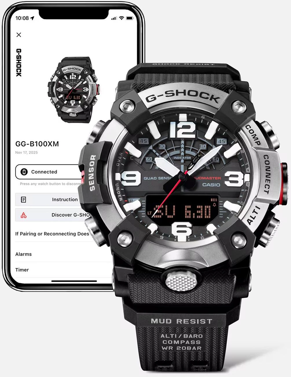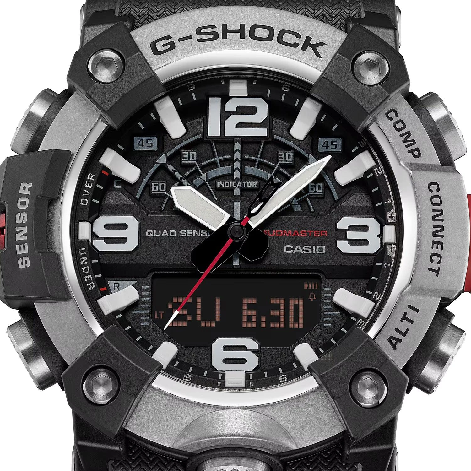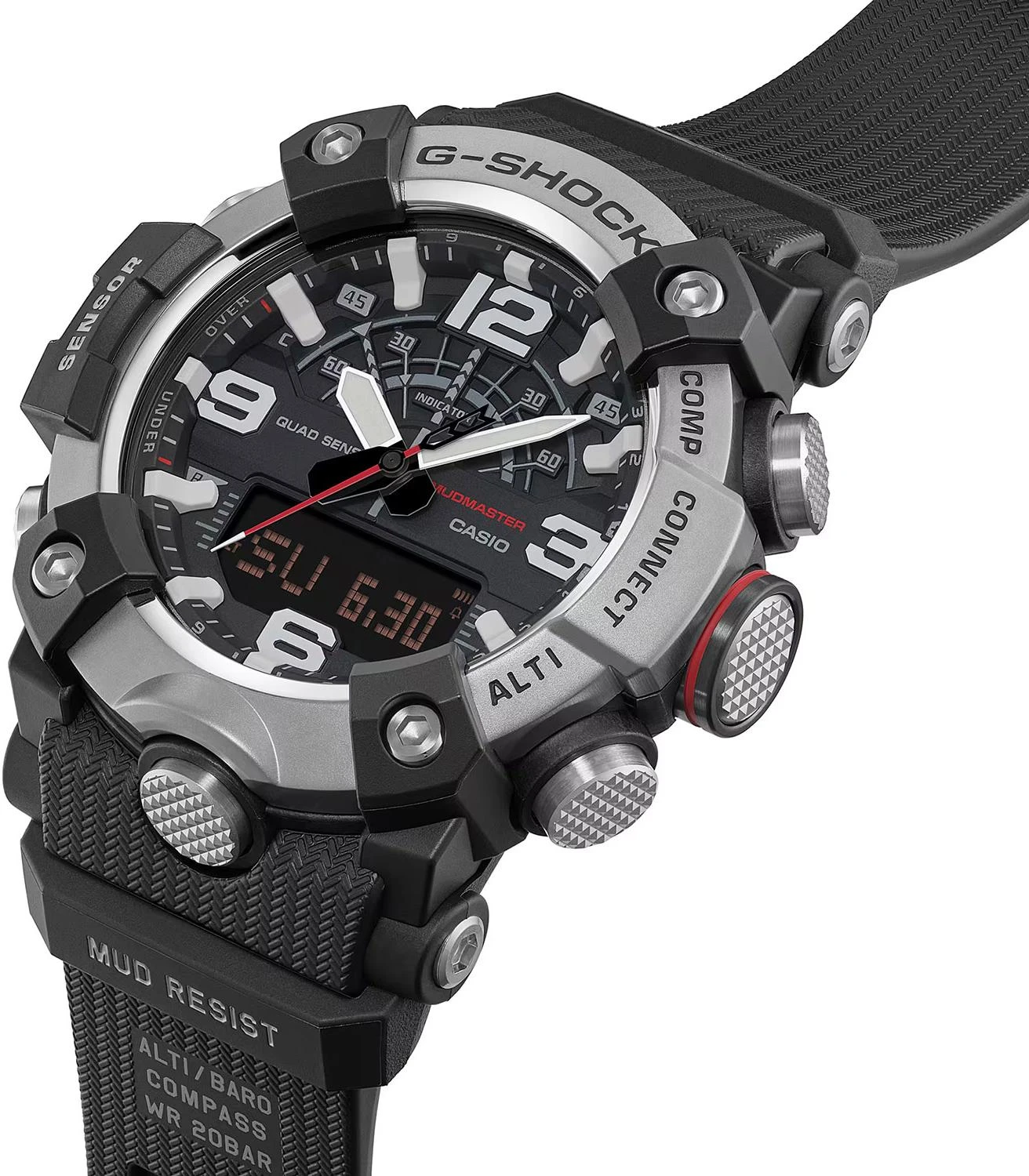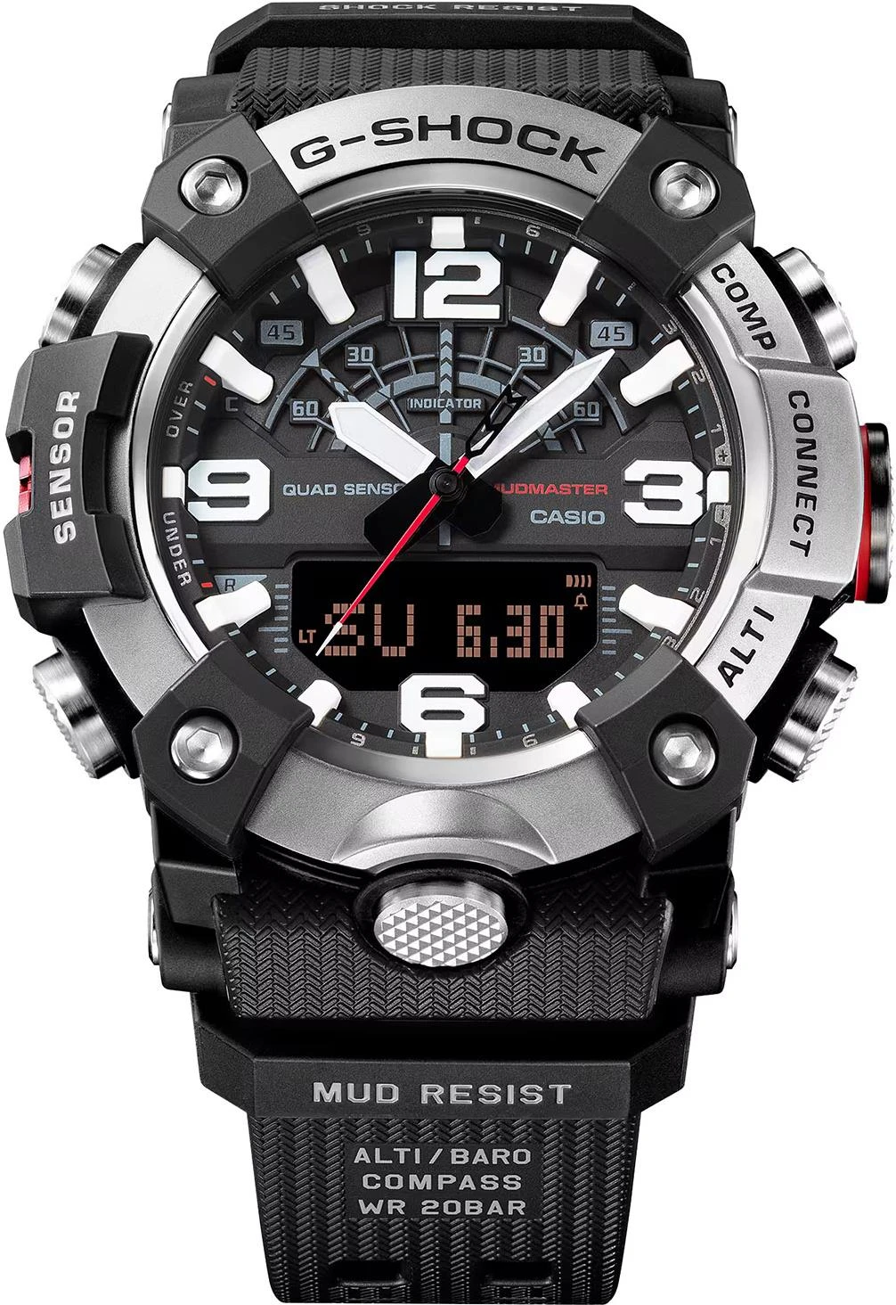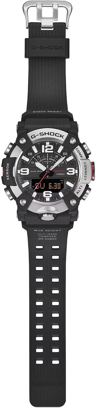 Master of G Mudmaster. Кварцевые мужские часы в корпусе с карбоновым усилением Carbon Core Guard, обеспечивающим исключительную ударопрочность и защиту от вибраций. Особая герметичная конструкция кнопок и корпуса надежно защищает механизм от попадания пыли и грязи. Модель оснащена технологией Bluetooth для синхронизации со смартфоном, автоматической корректировки времени и использования функций приложения CASIO WATCHES. Двойная светодиодная подсветка высокой яркости (Super Illuminator): отдельный светодиод для аналогового циферблата и отдельная подсветка для цифрового дисплея. Система оснащена функцией автоматического включения при наклоне руки к лицу, возможностью выбора длительности свечения (1,5 или 3 секунды) и режимом послесвечения. Цвет подсветки: белый.