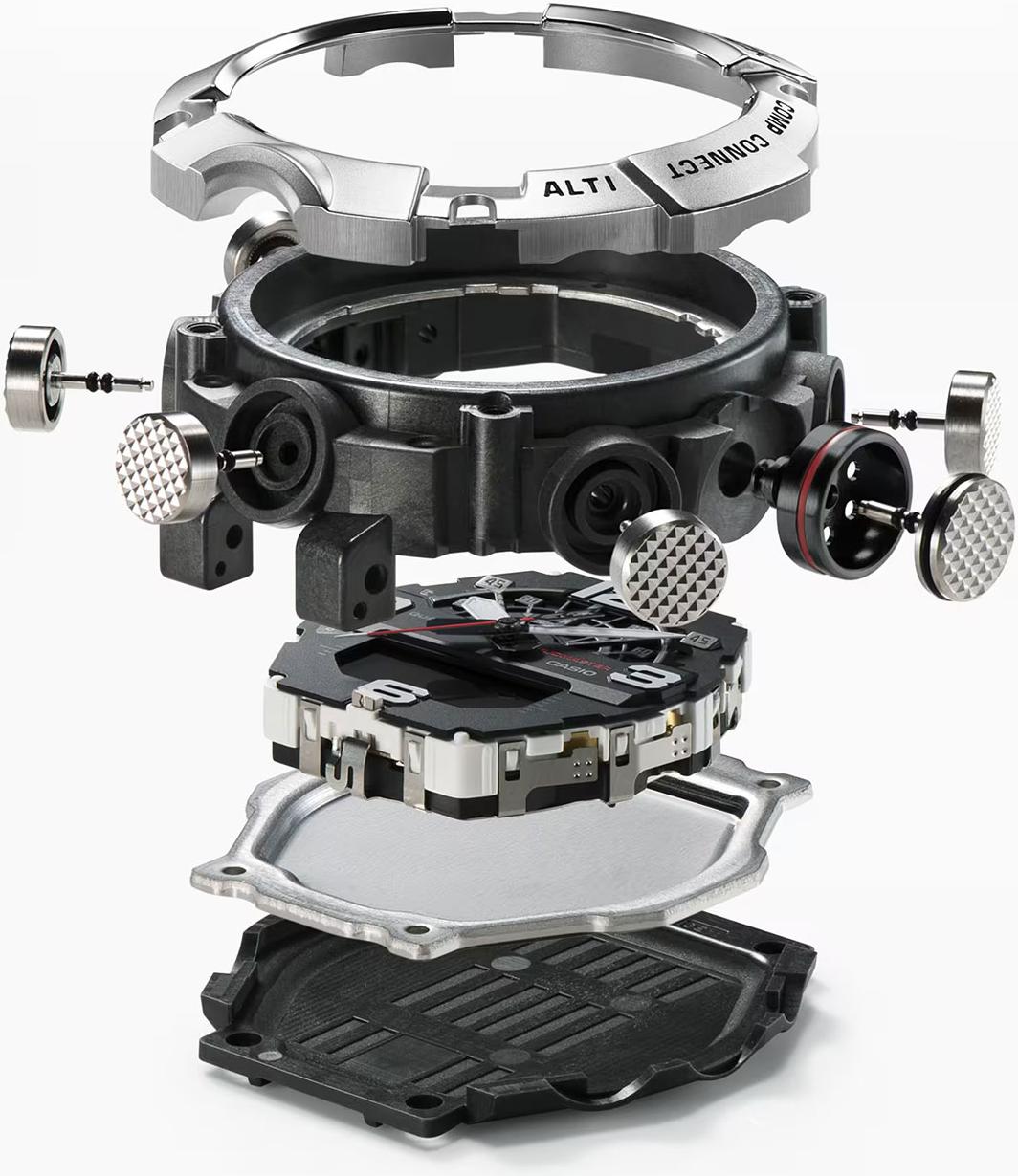 Часы оснащены Quad Sensor, объединяющим цифровой компас с коррекцией магнитного склонения, альтиметр до 10 000 м с памятью на 14 записей, барометр с графиком атмосферного давления и термометр (от -10°C до +60°C). Встроенный трехосевой акселерометр выполняет функцию шагомера. Доступны данные о времени восхода и заката солнца, функция мирового времени в 38 городах, секундомер с точностью 1/100 секунды, таймер обратного отсчета до 24 часов и 5 ежедневных будильников. Предусмотрены функция перемещения стрелок для удобного чтения цифрового дисплея, ежечасный сигнал и автоматический календарь до 2099 года. Циферблат защищен прочным сферическим минеральным стеклом. Безель из нержавеющей стали. Водонепроницаемость составляет 200 метров (WR 200). Габариты корпуса: 55,4 х 51,3 х 19,4 мм, вес — 104 г. Примерный срок службы батареи CR2025 составляет 2 года.