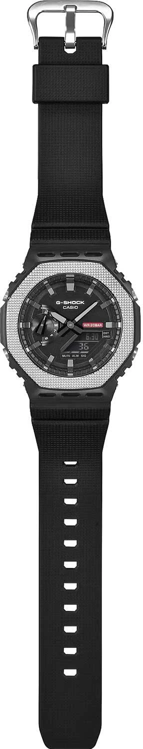 G-Shock Modern Industrial. Мужские часы. Текстурированный безель и красная накладка на циферблате символизируют приверженность G-SHOCK к абсолютной прочности. Противоударный корпус защищает механизм от ударов и вибрации. Двойная подcветка: циферблат и ЖК-дисплеи подсвечиваются светодиодом, благодаря наличию функции задержки, после отпускания кнопки освещение горит еще несколько секунд. Настраиваемое послесвечение 1,5 или 3сек. Цвет подсветки: белый. Необритовое светонакопительное покрытие обеспечивает длительное послесвечение в темноте даже после кратковременного нахождения на свету.