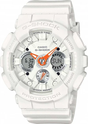 Женские наручные часы Casio G-Shock GM-S110LB-2A. Точный кварцевый механизм с аналого-цифровой индикацией. Корпус изготовлен из высококачественной нержавеющей стали 316L с высокими антикоррозийными свойствами. Светодиодная подсветка. На циферблате отображается текущее число, месяц и день недели. Ударопрочная конструкция часов защищает от ударов и вибрации. Функция хронографа. Функция таймера. Таймеры обратного отсчета напомнят Вам о текущих или особенных событиях, издав звуковой сигнал в установленное время. Для подсветки дисплея используется светодиод, а так же имеет функцию автоматического включения подсветки, если Вы наклоните часы к своему лицу. Функция будильника. Аккумулятор обеспечивает часы достаточным питанием приблизительно на 3 года. Отображение текущего времени в основных городах и конкретных областях по всему миру. После настройки автоматический календарь всегда отображает точную дату. Отображение времени возможно в 12-часовом или 24-часовом формате. Полимерный ремешок. Натуральный полимерный материал является идеальным для изготовления ремешка благодаря своей чрезвычайной прочности и гибкости. Прочное, устойчивое к царапинам минеральное стекло защищает часы от повреждений. Часы являются водонепроницаемыми до 20 Бар. Цвет корпуса: Голубой. Цвет циферблата: Голубой. Ширина (с заводной головкой): 46мм. Толщина: 13мм. Гарантия: 2 года. Другие наименования модели: GM-S110LB-2AER.